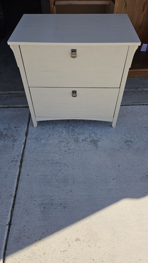 This end table is in nice condition. The drawers work fine. The size is 30 inches high by 32 inches wide by 20 inches deep.
