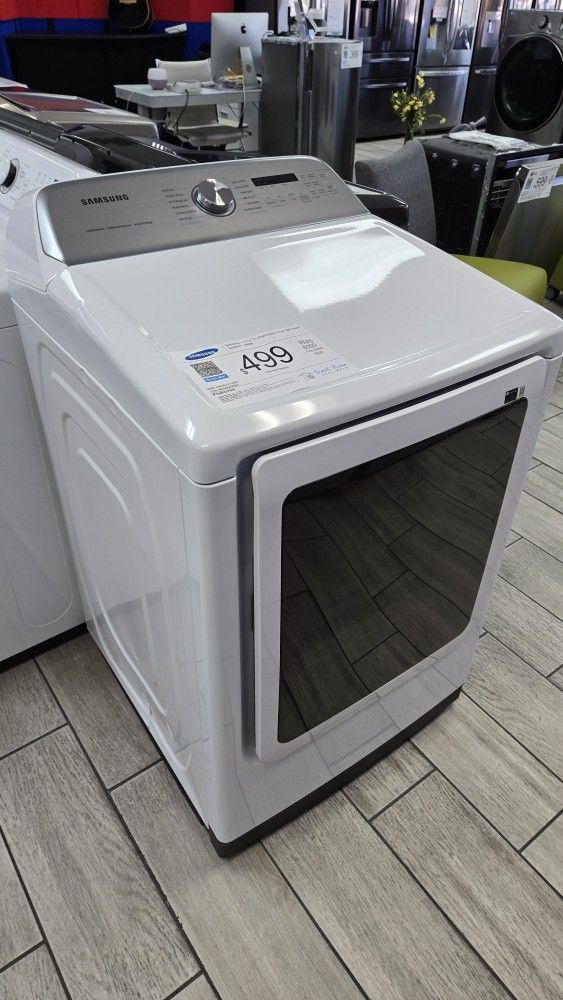 Samsung - 7.4 Cu. Ft. Smart Electric Dryer with Steam Sanitize+ - White JUST $499 Up to 70% Retail Discount in all items! Call or Text us at: (contact info removed) Visit us today! 7045 S State Street STE 1 Midvale, Utah, 84047 Steam Sanitize+ Our Steam Sanitize+ cycle removes 95% of pollen¹ from fabric, while Multi-Steam refreshes clothing and relaxes light wrinkles. Wi-Fi Connectivity with SmartThings Wi-Fi connected so you can receive end-of cycle alerts, remotely start or stop your washing, schedule cycles on your time, and more, right from your smartphone with the SmartThings App.² Sensor Dry Automatically optimizes the time and temperature of your drying cycle to protect your clothes from heat damage, while avoiding excess energy use. Smart Care Easy troubleshooting from the convenience of your smartphone.³ Smart Care interacts with your washer and dryer to perform an immediate diagnosis and offer quick solutions. Internal Drum Light An internal drum light lets you see the contents of your dryer more clearly, resulting in fewer missed socks or small items. Reversible Dryer Door Choose which way your dryer door opens to better suit your laundry room layout. Accessibility (AUI, Braille) Aiding the visually and hearing impaired, your washer and dryer now feature audio assistance, playing a different sound for each option, and braille right next to key control panel buttons. Large 7.4 cu. ft. Capacity Fewer loads, less time in the laundry room, and more time doing the things you love. Lint Filter Indicator Worry less about lint or fluff blocking the dryer's air intake. The control panel provides a helpful reminder to clean the filter to keep your dryer running smoothly. Matching Washer Samsung washers and dryers team up to make light work of laundry day.