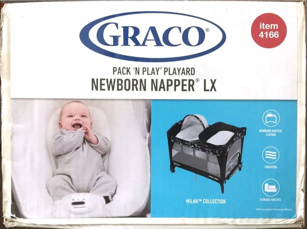 GRACO Pack N Play Newborn Napper LX, Milan... NEW! ...Grows with your child! Product Description: Graco Pack 'n Play with Newborn Napper LX grows with your child as you place your newborn in the cozy micro-fleece napper station, then as your infant rests in the comfortable full-size bassinet, to your playful toddler safe in the full-size playard. The Pack 'n Play with Newborn Napper LX offers space-saving convenience with its stylish built-in storage shelves that allow you to keep blankets, diapers, pajamas and other necessities close by. Recommended Use Napper: Infants under 3 months unable to roll over Bassinet: Babies under 15 lbs Changing Table: Babies under 30 lbs Playard: Children under 35" tall, unable to climb out Condition: - NEW! Product Features - Newborn napper with shelves, changing station, and vibration for soothing comfort Technical Details: - Item Weight: 30 pounds - UPC; 0(contact info removed)3543 - Item Model Number: 1933767 - Style: Milan - Batteries Required: No Shipping Information: - Packaged with the utmost care - Ships same day or next day at the latest (after payment)