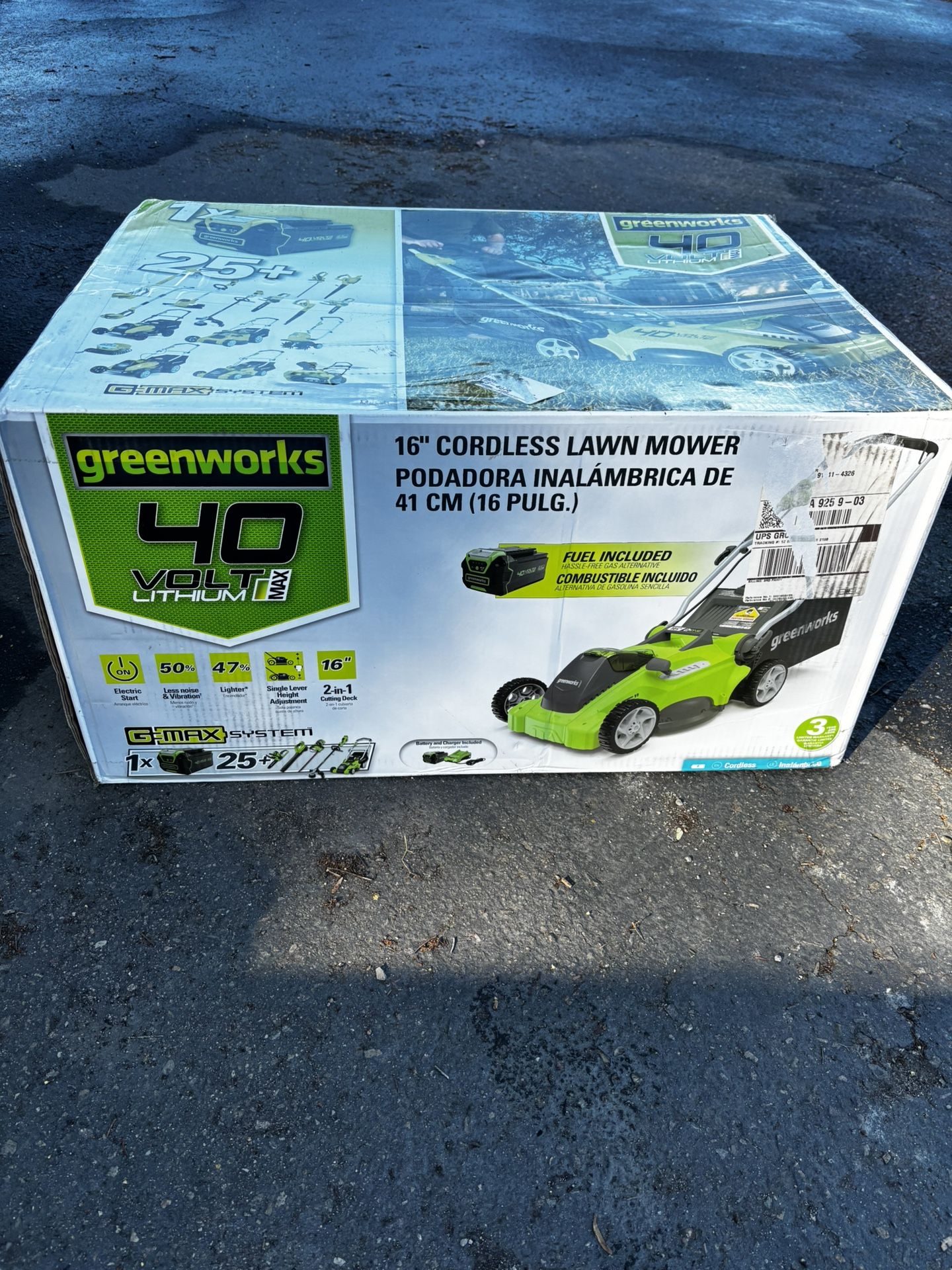 Brand new, in an unopened box. Bought it and never ended up needed it. Amazon and wal mart are selling it for 280.00. Amazon https://a.co/d/ckVGiaG Wal mart https://www.walmart.com/ip/Greenworks-40V-16-Battery-Powered-Push-Lawn-Mower-with-4-0-Ah-Battery-25322/27694382?wmlspartner=wlpa&selectedSellerId=0&adid=2222222229827694382_0000000000_22264615354&wl0=&wl1=x&wl2=m&wl3=&wl4=&wl5=9031291&wl6=&wl7=&wl8=&wl9=pla&wl10=8175035&wl11=online&wl12=27694382&veh=sem&gclsrc=aw.ds&gad_source=1&gad_campaignid=22264616125&gbraid=0AAAAADmfBIoO0LsgkNbY389bfO7N0fdHy&gclid=Cj0KCQiAgP_JBhD-ARIsANpEMxwuviEoYK455nlbhk8qdcS4WUPcvPaQzsI9459UIMCixRw3cj68v0QaAg1-EALw_wcB&sid=a7f4ceb8-0e4e-4cf6-bf9d-d12942288799