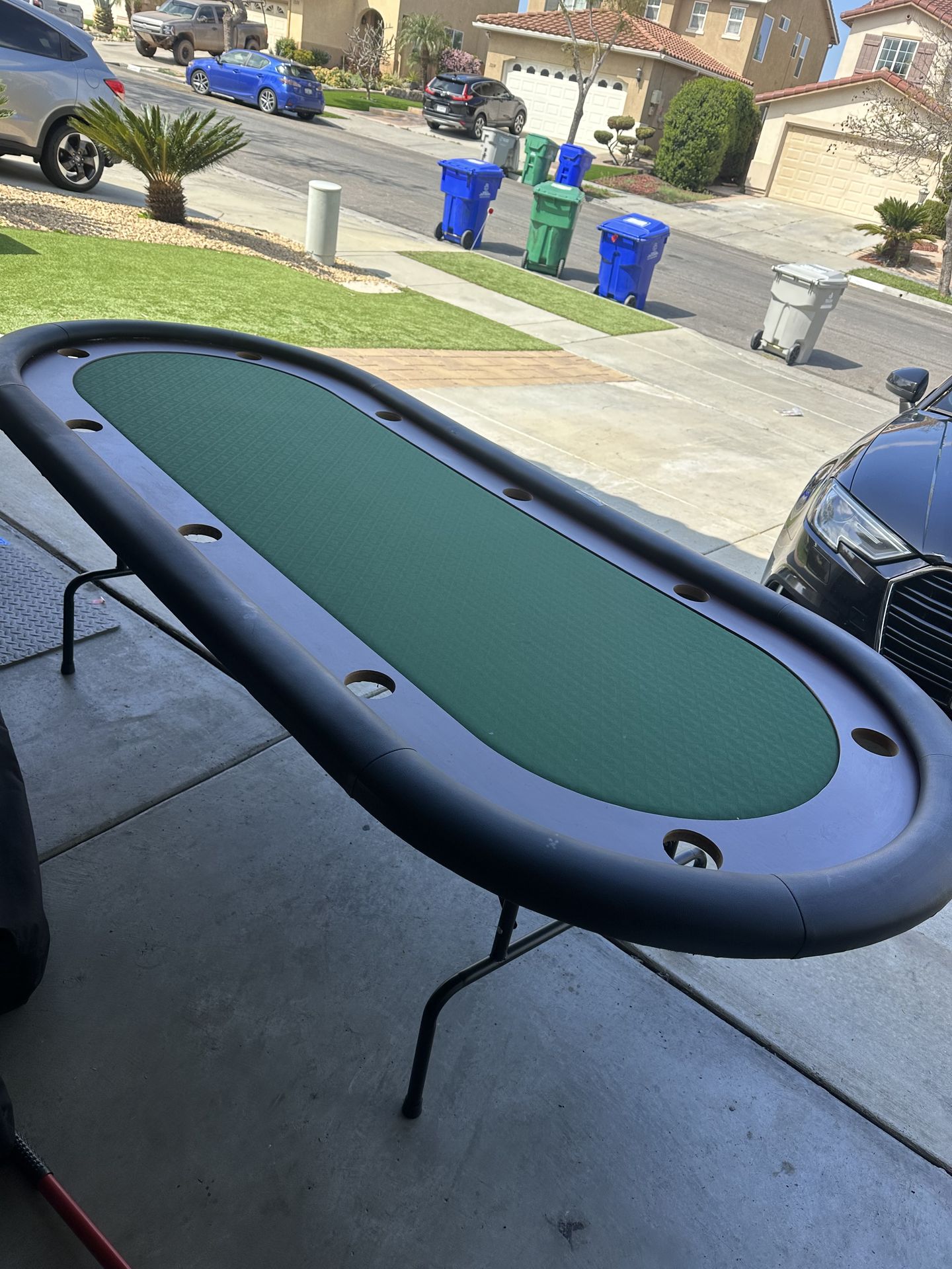 10 seat poker table with cup holders included‼️ Never used. like new poker table. Missing 6 screws on bottom ( easy fix). Missing 1 cup holder. No real damage. 86”x41”