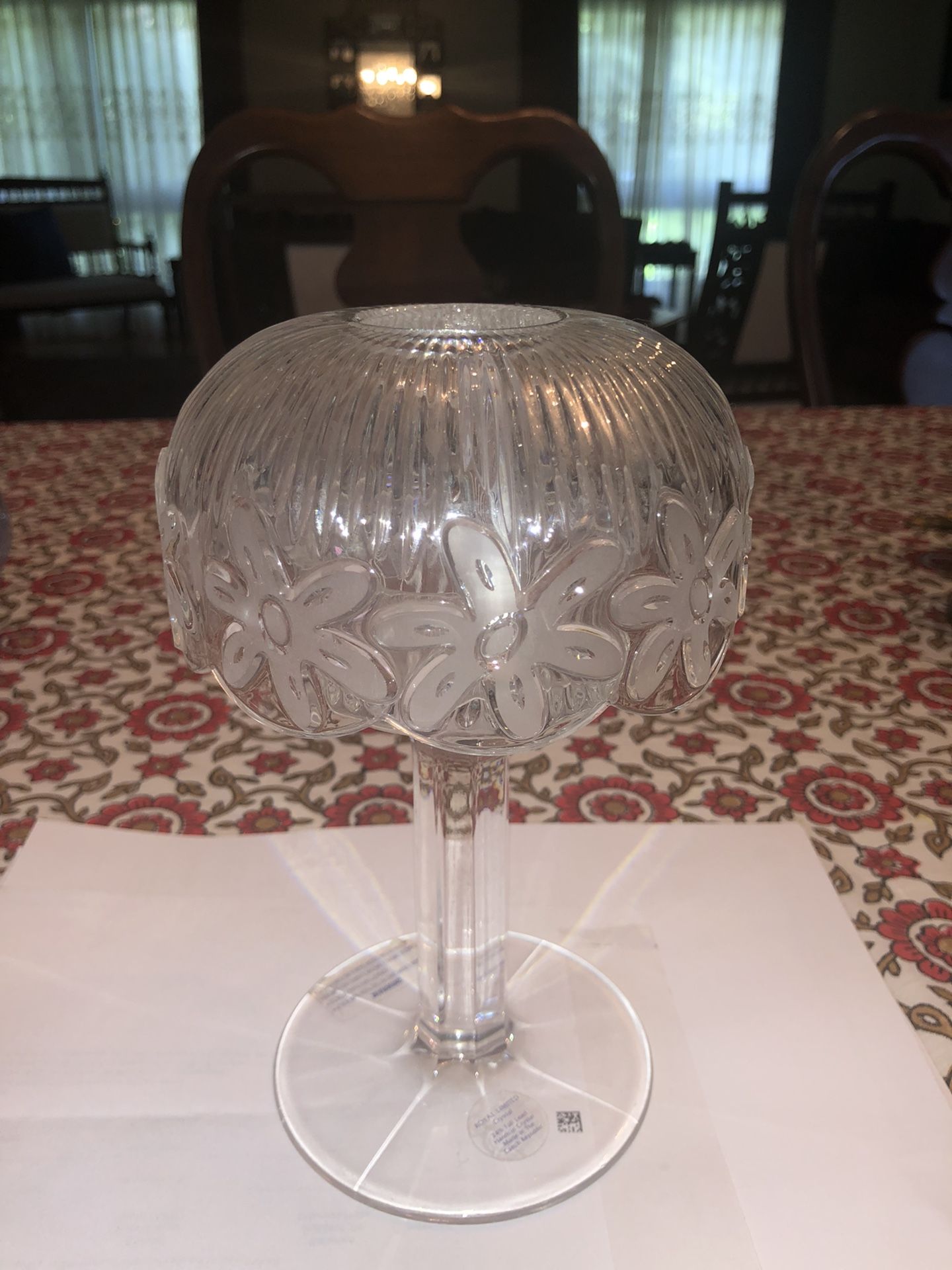 A two piece candle holder. Ideal for votive candle. Made of carved glass. Looks like crystal. The top comes off making cleaning n replacing candles very easy.
