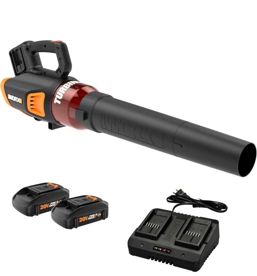 Open box, new About this item HARNESS THE HIGH-FORCE POWER: With TURBINE fan technology this battery leaf blower produces strong airflows up to 430 CFM and 90 MPH—the ideal level for effortless leaf gathering, driveway sweeping, and many other tasks SAME BATTERY, EXPANDABLE POWER: The same Power Share batteries that run this cordless leaf blower can conveniently be used with 140 plus power tools, outdoor power equipment, and lifestyle products from the Worx Power Share platform CORDLESS LEAF BLOWER WITH BOOSTED POWER: With its High-Efficiency Brushless Motor, this 40V blower achieves 50 percent longer runtime, 25 percent more power, and a 10X longer life than standard brushed motors SET THE PERFECT SPEED: Stay in control of blower cordless power with 3-Speed Control Plus TURBO. Easily switch speeds to fit the demands of your task. Power up with TURBO mode to breeze through tough jobs—like clearing wet leaves and stubborn debris LIGHTWEIGHT AND COMPACT: A cordless leaf blower with battery and charger doesn't have to wear you down. This high-performance blower weighs only 7.3 lbs. (w/ battery) and features an easy-carry one-handed design to maximize control and reduce user fatigue INCLUDES: 40V TURBINE Cordless Leaf Blower, (2) 20V 2.5Ah Battery, (1) Dual Charger