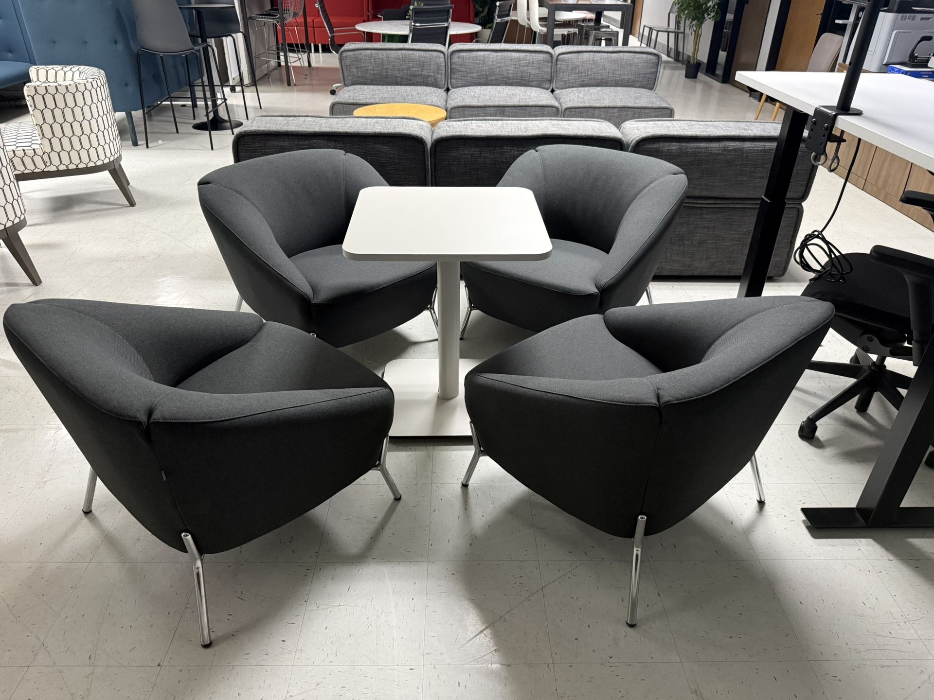 Lounge Chairs Designer Set (4 Lounge Chairs + Small Table) β Excellent Condition! Price: $1,800 (set) Condition: Gently used β clean, sturdy, and modern Location: Union City, California βΈ» ποΈ About this Set Beautiful designer lounge set featuring four contemporary lounge chairs and a matching low-height table. Perfect for offices, lounges, reception areas, or upscale waiting rooms. β Premium modern design β Comfortable deep seating β Durable gray upholstery β Sturdy metal legs and sleek finishes β Matching table completes the look Ideal for: π’ Office reception or collaboration areas π Home or studio lounges β Coffee shop or lobby seating βΈ» π·οΈ Details β’ Quantity: 4 lounge chairs + 1 table β’ Material: Fabric upholstery / Metal base /Laminate table β’ Color: Dark gray chairs / White table β’ Condition: Excellent β no tears or stains β’ Price: $1,800 for the full set βΈ» π² Contact Message me today β first come, first served. Pickup in Union City, or local delivery available for a small fee.