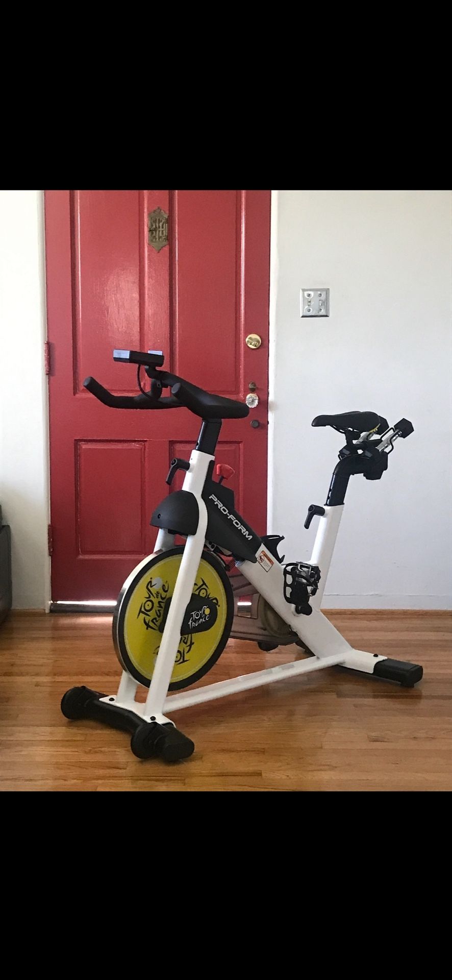 Proform Tour De France spin bike. Excellent lightly used condition. Everything works perfectly. Box included Bought from Costco- moving and selling everything