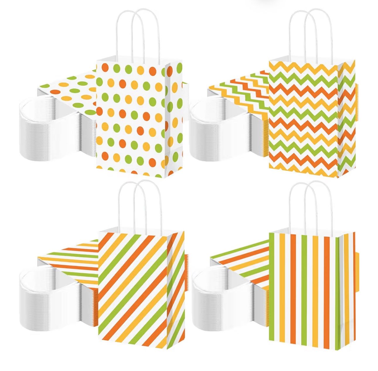 TaoBary 100 Pcs Paper Fall Gift Bags Bulk with Handle Colorful Stripe Wave Polka Dot Treat Goodie Candy Bags Sufficient Quantity: you will receive 100 pieces fall gift bags in 4 different designs, 25 pieces each design, sufficient quantity and various style can meet your fall gift packaging and Fall party decorations needs Chic Designs: our paper treat bags are designed in 4 different designs, such as polka dot, stripes, wave and more, with classic festival colors and patterns Size Information: each gift bag with handle measures about 8.27 x 5.91 x 3.15 inches/ 21 x 15 x 8 cm, which can satisfy the packaging of most kinds of gifts, such as gift boxes, toys, chocolates, gift cards, homemade items and other gifts Quality Material: these paper goodie bags are made of paper material, reliable and sturdy, with clear printing and good workmanship; And the handle design can also give you much convenience Wide Application: these autumn gift bags can be applied for many occasions, they not only can be served as awesome party favors bags, package for your gift, toys, greeting card, chocolate and others, but also ideal for birthday parties, daily use, you can put them on the table to decorate or package your gifts, making your party and gifts more special and impressive