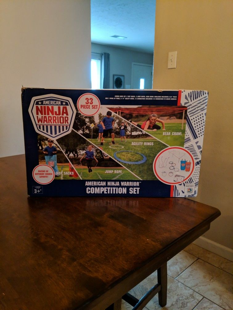New! Still in the box. The set includes diagrams for suggested course set-ups, two 30” x 20” reinforced hop sacks, eight 14” agility rings with dual use connectors, two competition jump ropes, birch wood bear crawl posts, and over 150’ of twine. Head-to-head, team or timed competition! Includes 2 hop sacks, 2 jump ropes, 8 agility rings with connectors, bear crawl Use the suggested course set-ups or create your own! Ages 3+ Endorsed by American Ninja Warrior for top training