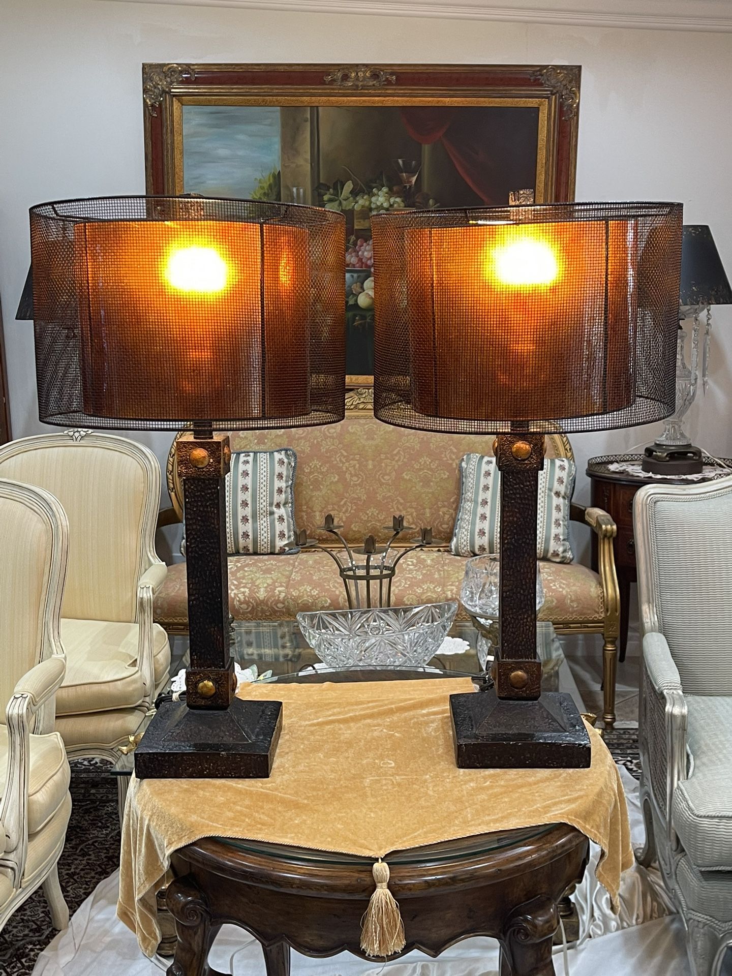 Pair of Beautiful Unique Lamps with Amber Mica Shade Beneath a Black Metal Mesh & Dark wood Base🌷