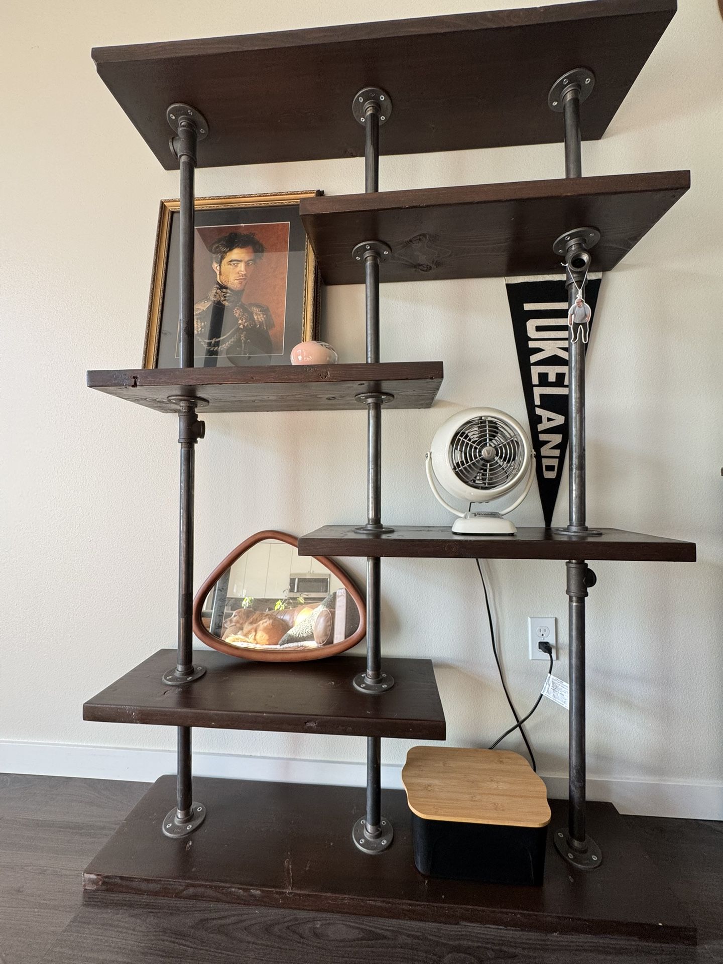 Industrial-style Bookshelf/Shelving Unit 72”H x 48.75”W. 11” deep. One-of-a-kind. Made by hand from raw pine and real piping, finished in a dark stain and sealed. A matching wardrobe/clothing rack is also available for sale and I’d provide a discount if both items are purchased. For pickup in Newcastle, WA.