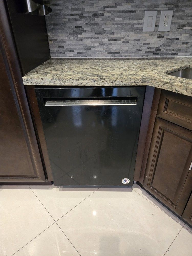 The KitchenAid KDFE104HBL is a built-in, front-control dishwasher with a black finish and a quiet 46 dBA operation. It features the ProWash Cycle that automatically adjusts to soil levels and a durable stainless steel interior. Key Features & Specifications The KitchenAid KDFE104HBL offers a range of features aimed at effective cleaning and user convenience. ProWash Cycle: This cycle uses sensors to determine soil levels and adjusts the wash cycle time and water usage in real-time for optimal cleaning performance. Sani-Rinse Option: Heats the final rinse water to 155°F, which eliminates 99.999% of food soil bacteria. Durable Stainless Steel Interior: The stainless steel tub resists streaks, stains, and odors while retaining heat to improve drying performance. Heat Dry & Extended Heat Dry Options: Provides the flexibility to use a heated drying element or extend the drying time for better results. SatinGlide Max Rails (Upper Rack): Allows the upper rack to move smoothly, even when fully loaded. Fold-Down Shelf with Stemware Holders: Adds versatility to the upper rack, providing space for wine glasses, small cups, or long utensils. Quiet Operation: Operates at a quiet 46 dBA, which is soft enough to have a conversation nearby without interruption. Capacity: Can accommodate up to 14 place settings. Control Lock: A safety feature to prevent unintended use.