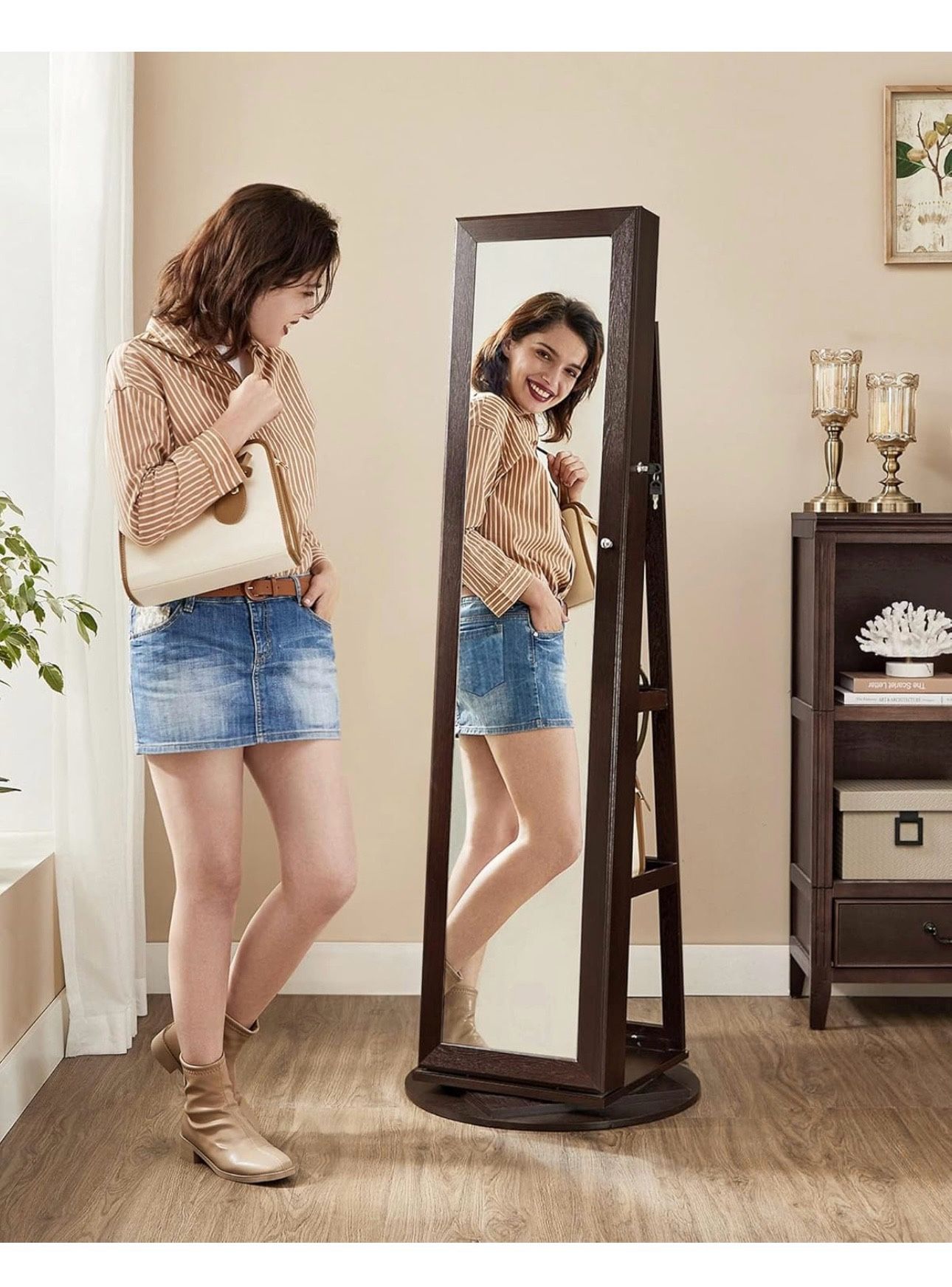 360° Swivel Jewelry Cabinet, Lockable Jewelry Organizer with Full-Length Mirror, Rear Storage Shelves, Interior Mirror, Jewelry Armoire, Gift Idea, Br