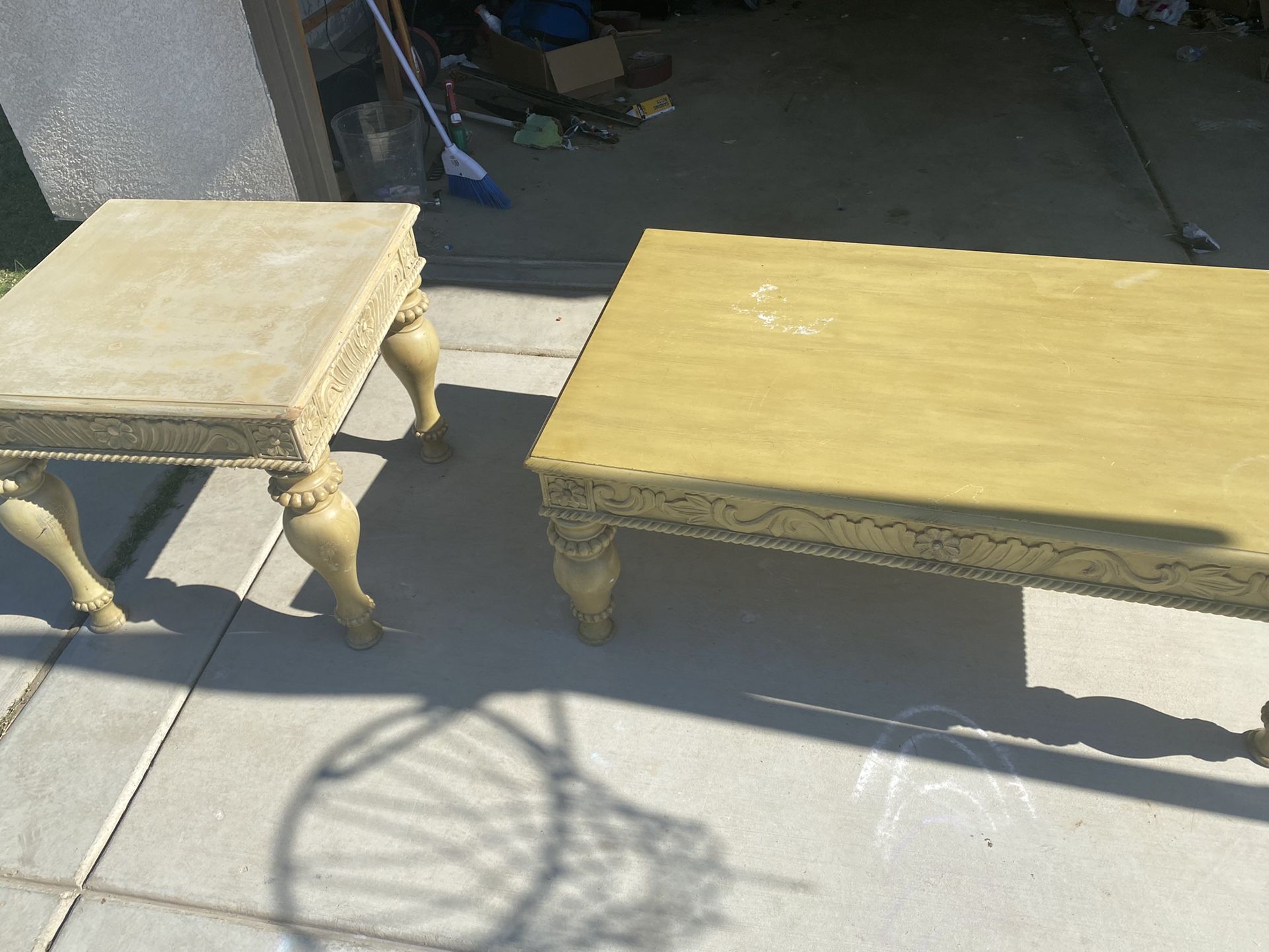 Great for restoration! The side table is partially sanded. Both tables are stable, just need some TLC. $60 for the set.