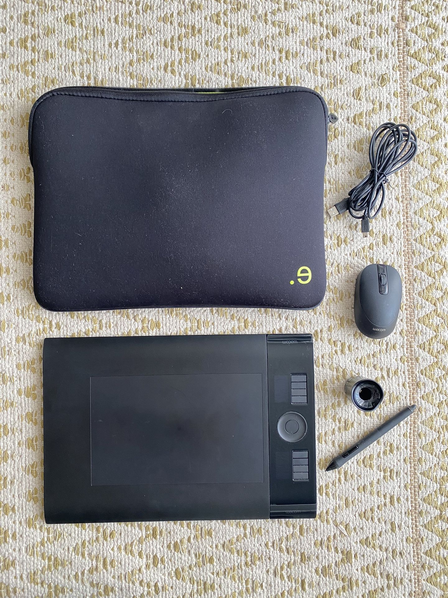 Barely used, fully complete with all included acessories: mouse, pen, brush tips, cable, & tablet cover. Product Dimensions: 10 x 14.6 x 0.5 inches * Quickly and professionally edit photos and create digital artwork with natural pen control * New pen tip sensor technology lowers activation force and captures every nuance of pen pressure * 2048 levels of pen pressure sensitivity for precise pressure control * User defined Express Keys and multi function Touch Ring put time saving shortcuts, modifiers, scrolling, zooming, and more at your fingertips * Active surface area: 5.5x8.8 The medium Intuos4 tablet is the most popular and versatile choice among creative professionals. With 48.5 square inches of working area, this tablet provides ample workspace for most tablet users. The medium size is built with eight ExpressKeysn and illuminated ExpressKey displays that provide easy reference to your assigned functions.