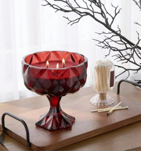 6" Faceted Coup Haunt Couture Glass Red Wax Filled 3-Wick Candle Goblet/Chalice. This object is a Faceted Coup Haunt Couture Glass Filled Red Wax Candle, part of the Threshold™ brand. Product Details. Brand: Threshold™. Fragrance: "Haunt Couture," described as a rich, leather, and woodsy scent. Design: A red, 3-wick candle housed in a faceted ruby-red glass container with a pedestal base. Size: Approximately 7 oz. Reuse Ideas: Once the candle is finished, the glass container can be upcycled as a candy dish, trinket holder, or small planter. The glass design is often compared to vintage mid-century glassware, such as the Noritake Perspective pattern. Upcycling Potential Once the wax is finished, the decorative glass vessel is often repurposed for other uses: Home Decor: Small candy dish, jewelry holder, or key holder. Tabletop: Dessert compote or footed sherbet glass, similar to vintage Noritake "Perspective" glassware. Floral: Small vase using a flower frog for short-stemmed arrangements.