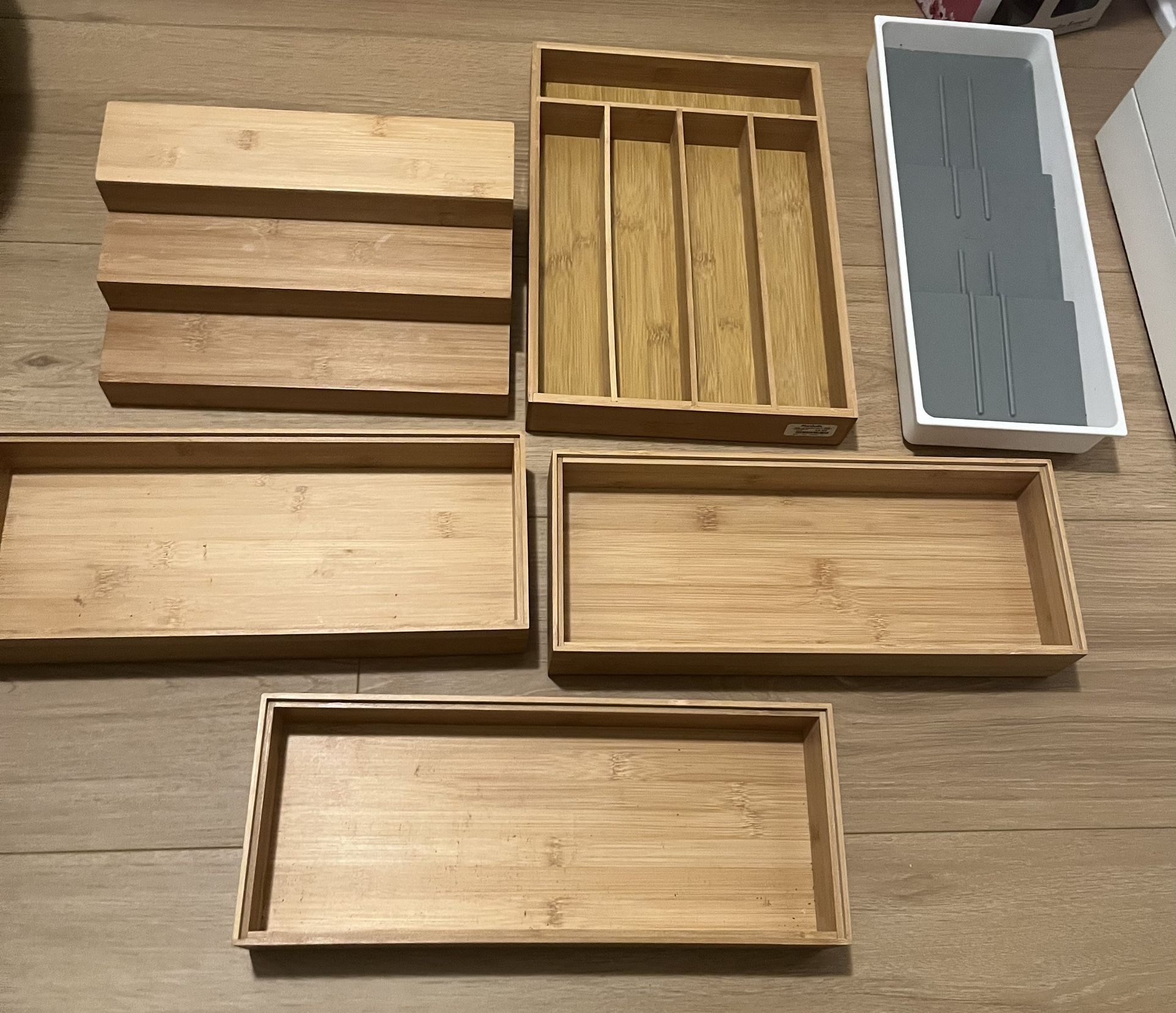 Kitchen organizer bundle: 3 wooden drawer inserts 1 wooden utensil organizer 1 wooden spice shelf rack 1 OXO drawer insert Pick up in Mira Mesa, San Diego