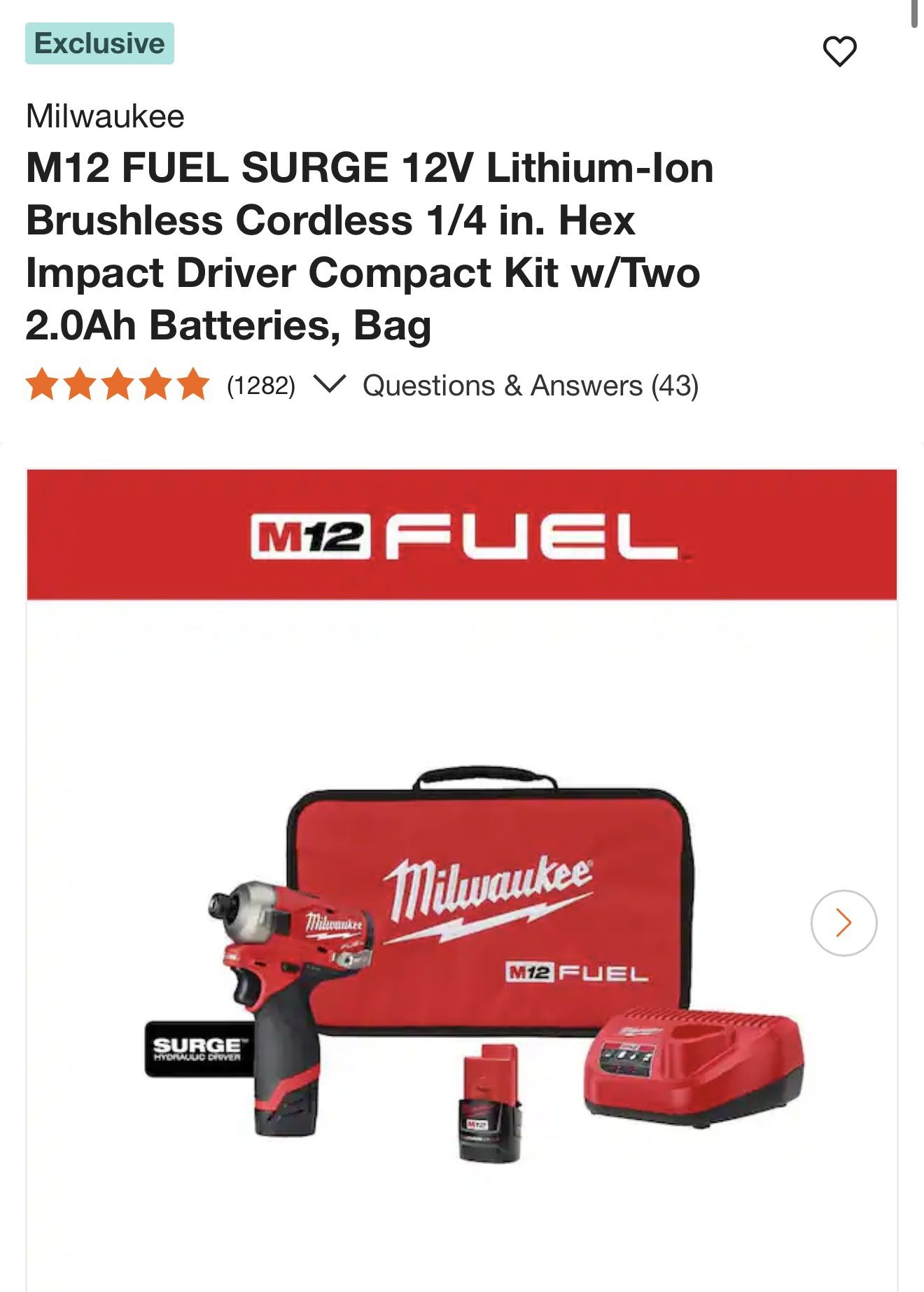 M12 FUEL SURGE 12V Lithium-Ion Brushless Cordless 1/4 in. Hex Impact Driver Compact Kit w/Two 2.0Ah Batteries, Bag