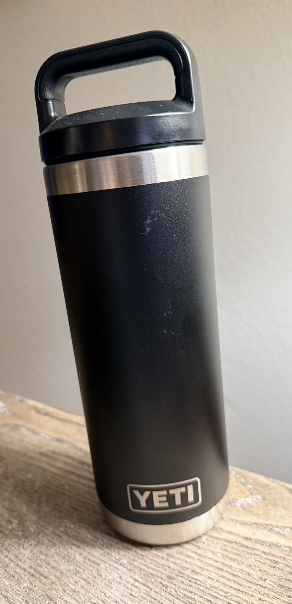 18OZ CUSTOM ENGRAVED YETI RAMBLER BOTTLE in Black Stainless steel YETI tumbler with handle. In excellent condition Pick up and Cash only please