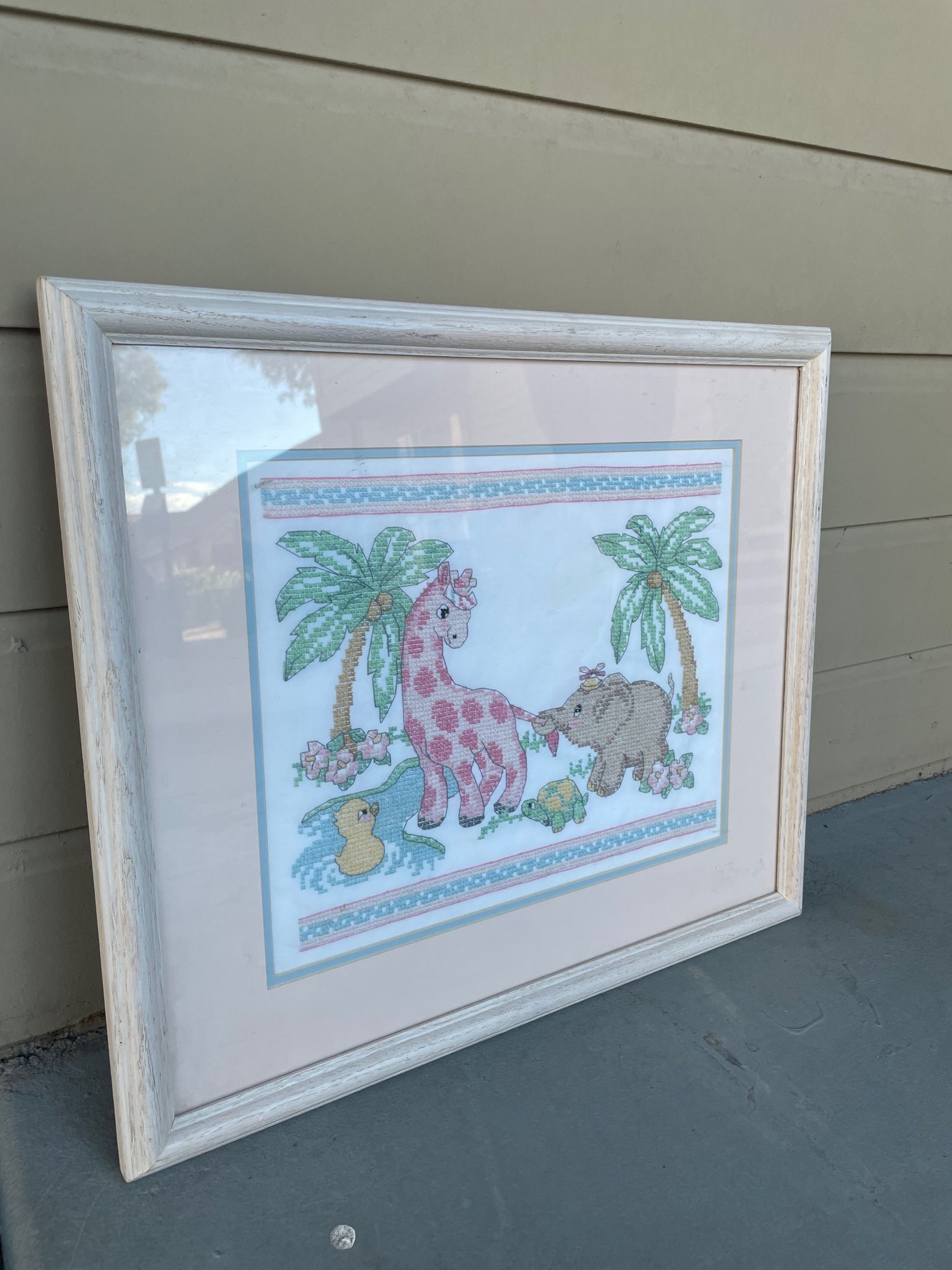 Sunset brand cross-stitch kit, matted in a vintage frame. Cute little coquette pastel animals Pickup in Tempe near southern & mill