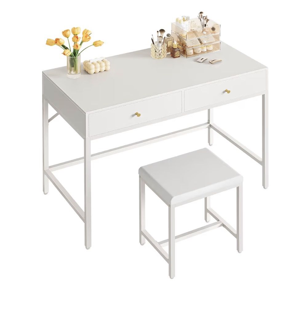 35.4" Desk with 2 Drawers, Modern Makeup Vanity with Padded Stool White