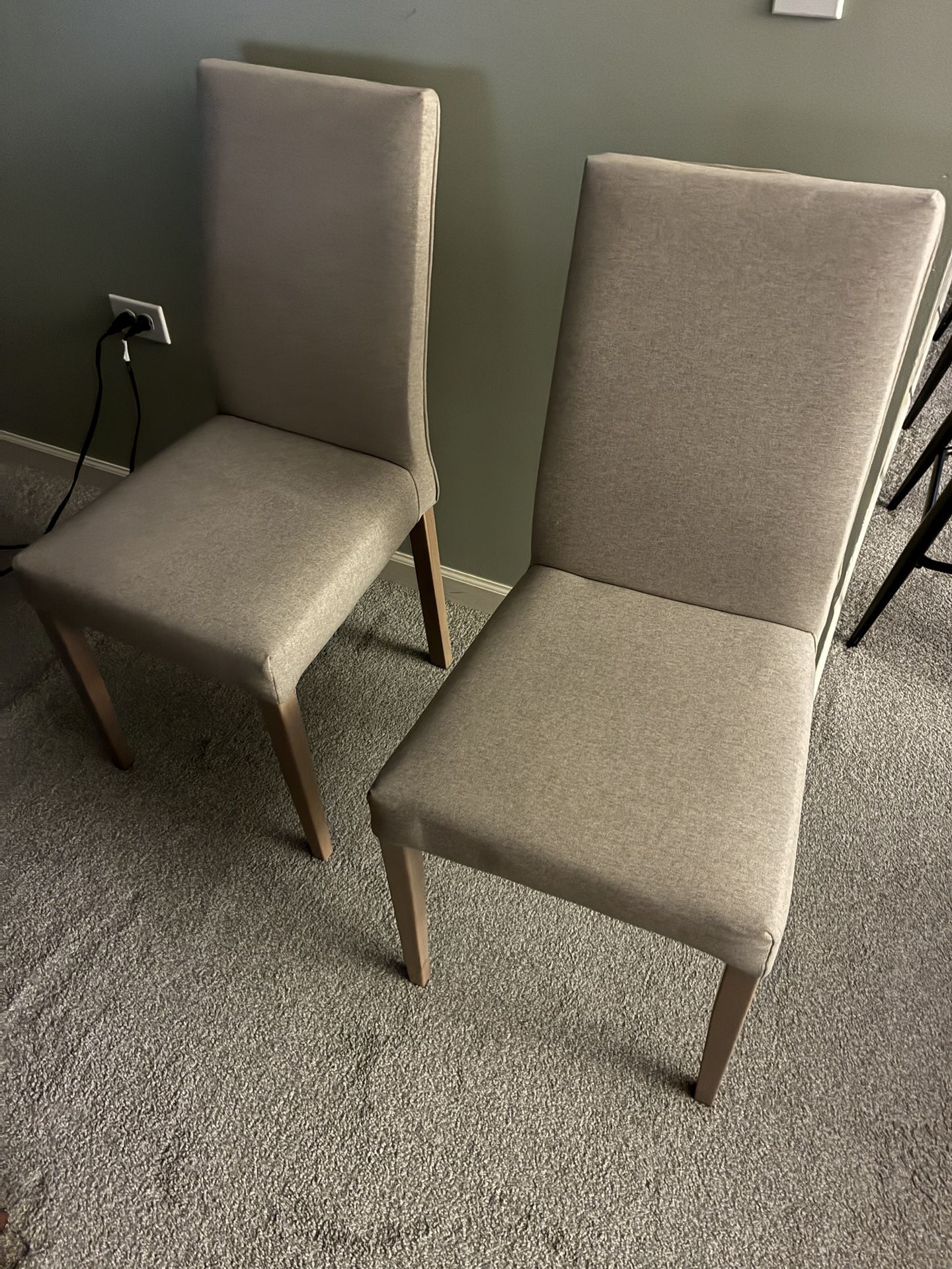 Modern set of 8 woven-fabric dining chairs in neutral grayish-beige with sturdy wooden legs. The textured weave and warm wood create a cozy, contemporary vibe perfect for everyday meals, family dinners, or hosting. Comfortable seat height and supportive backs make them practical and stylish. Dimensions (per chair) • Overall height: 35.4 inches • Width: 18.7 inches • Depth: 20.7 inches • Seat height (leg length): 15 inches Details • Brand: Enza Home woven fabric upholstery (holds up well to daily use) • Solid wooden legs (no wobbles) • From a smoke-free home • Good used condition with normal light wear; clean and sturdy Sold as a complete set (no singles)