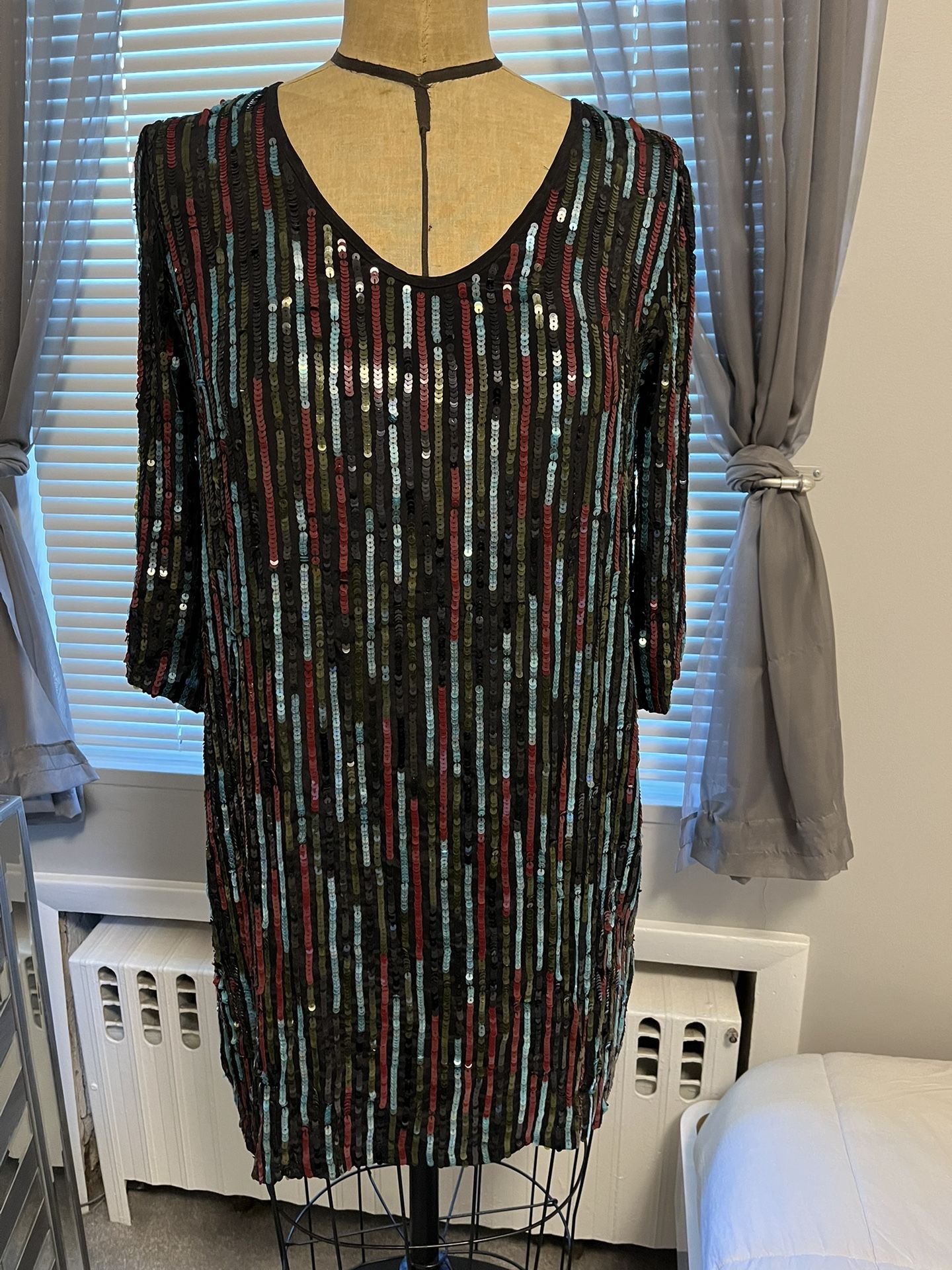Brand new sequin dress from Velvet by Graham & Spencer in size small. Made in India in striped sequins of red, green and turquoise. Relaxed fit for comfort, v neck and fully lined in black material. Measures approximately 20” pit to pit, 34” shoulder to hemline and sleeve is 16” and 3/4 length. Stock photo attached selling for $329. Includes envelope of extra sequins.