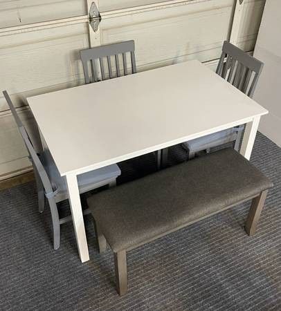 LIKE NEW 5-PC MINIMALIST LIGHT WEIGHT DINING SET (TABLE 3 CHAIRS WITH FABRIC PADS AND ONE PADDED BENCH) 🔹DIMENSIONS:(48” W)x(30" D)x(30" H) 🔹Perfect for Apartments, Small Dining Areas, Student dorms, or you can use it as a Kitchen Table. This 5-Piece Dining Table Set includes: 🔹1 White Rectangle dining table 🔹3 Gray Lightweight chairs 🔹1 Padded bench 🔹Excellent condition, Like new, very good looking condition. Fully assembled