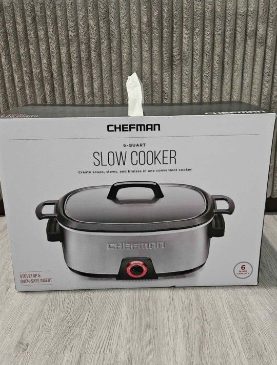 New in original packaging This stainless-steel electric slow cooker is countertop-friendly and perfect for tenderizing tough cuts of meat and slow-cooking savory soups, stews, and chilis. With the removable stovetop and oven-safe cooking insert, you can brown, bake, and sauté your favorite foods before slow cooking to enhance the flavor. This insert is lightweight and portable, so you can easily transport your dishes to the dinner table or bring your finished meals to family functions