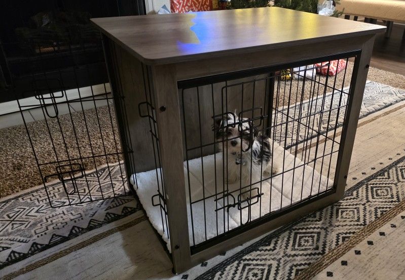 2 door dog Kennel for medium size dog. Gray oak. 26x23x20. Used only for a week. Got a second large dog that doesn't fit in it.