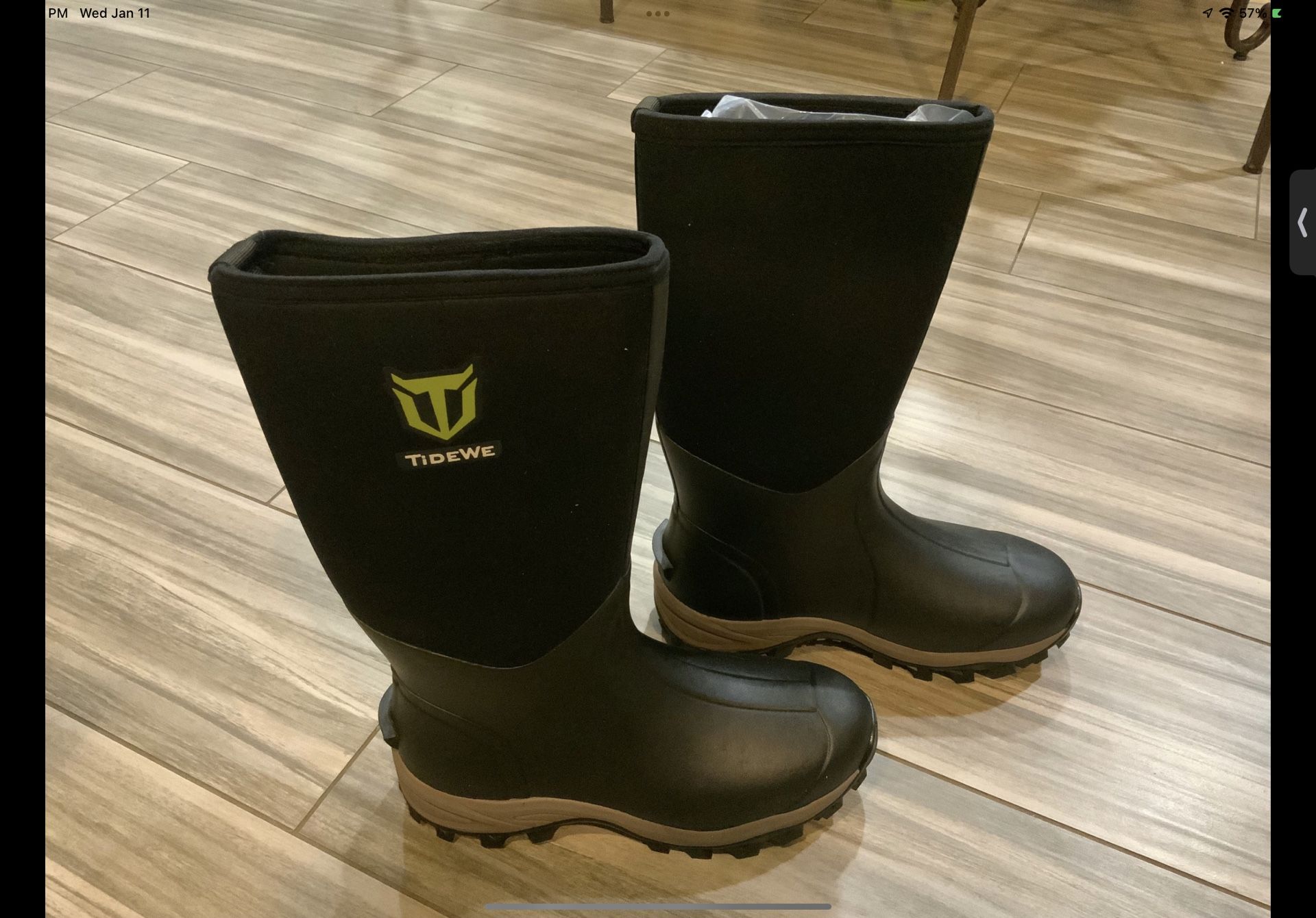 New. Open box. By Tidewe. Color is black. Fits men size 10 and women size 11. Made of 100% waterproof CR flex-foam. Absorbs impacts, retains heat, and flexes with your feet as you walk. It has heat resistant insulation that prevents radiated body heat from escaping. It is lightweight. It has 15 way stretch nylon to make your feet stay as comfortable as possible. Retails for $89.99. We have hundreds of items for sale.