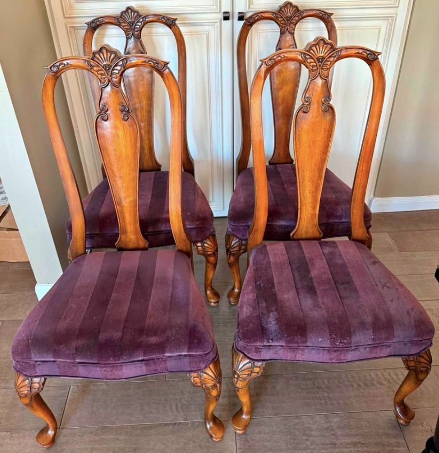 4 Beautiful Vintage French Provincial French Country Dining Chairs - Purple Upholstery - beautiful detailing on legs & back of chairs - 4 Side Chairs Google says the following (likely Baroque or Rococo style dining chairs with purple velvet upholstery. The design features ornate, elaborate hand-carved wood frames and distinctive gracefully curved, S-shaped cabriole legs. vintage or antique dining chairs in a Georgian or Queen Anne style, featuring a rich wood finish and cabriole legs. The chairs are characterized by their intricate shell carvings on the top rail and knees of the legs, and they are upholstered in a purple striped velvet fabric often made of solid mahogany or walnut and were produced in the late 19th or 20th century or French Louis XV Style Dining Chairs) Dimensions in photos I’m Downsizing due to Remodeling - Follow Me To See Other Items Pickup on North Side of Ofallon,Mo close to Hwy P & St. Paul Road First Come First Served No Holds Cash at Pickup Listed on Other Sites