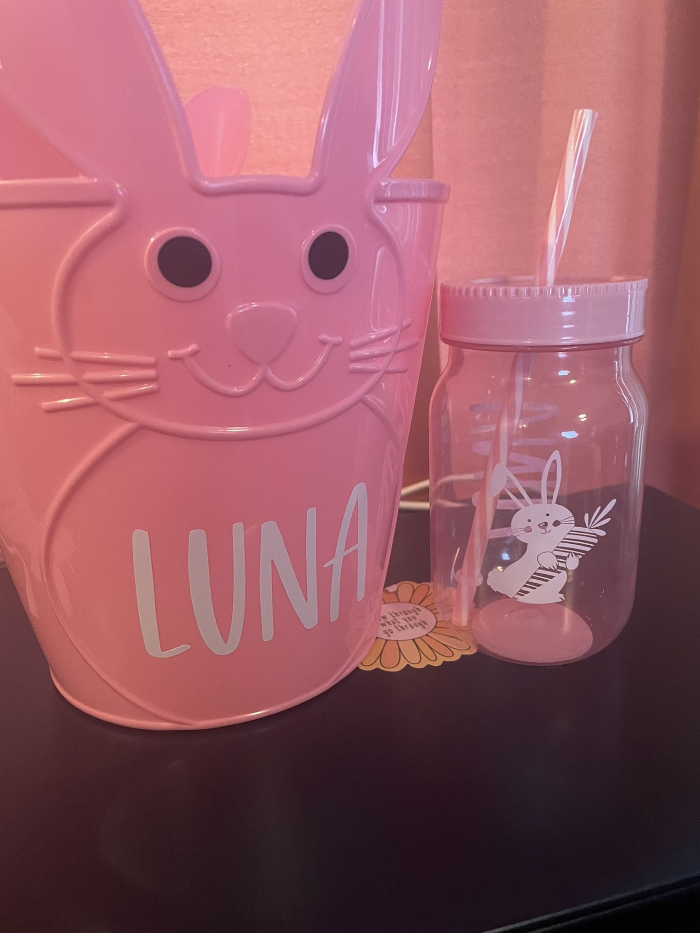 Easter baskets available in pink, yellow, and blue. Cups available in pink, orange, and purple. Taking orders now.