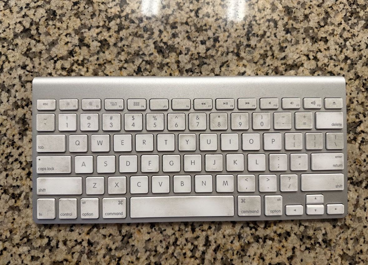 Brand: Apple • Model: A1314 (compact aluminum Bluetooth keyboard, 2×AA battery style) • Layout/Language: QWERTY, US English • Connectivity: Bluetooth (wireless) • Power: 2×AA batteries (not included) • Color/Finish: Silver aluminum with white keys • Approx. size: ~11.2″ × 4.7″ × 0.7″ (fits standard compact Apple footprint)