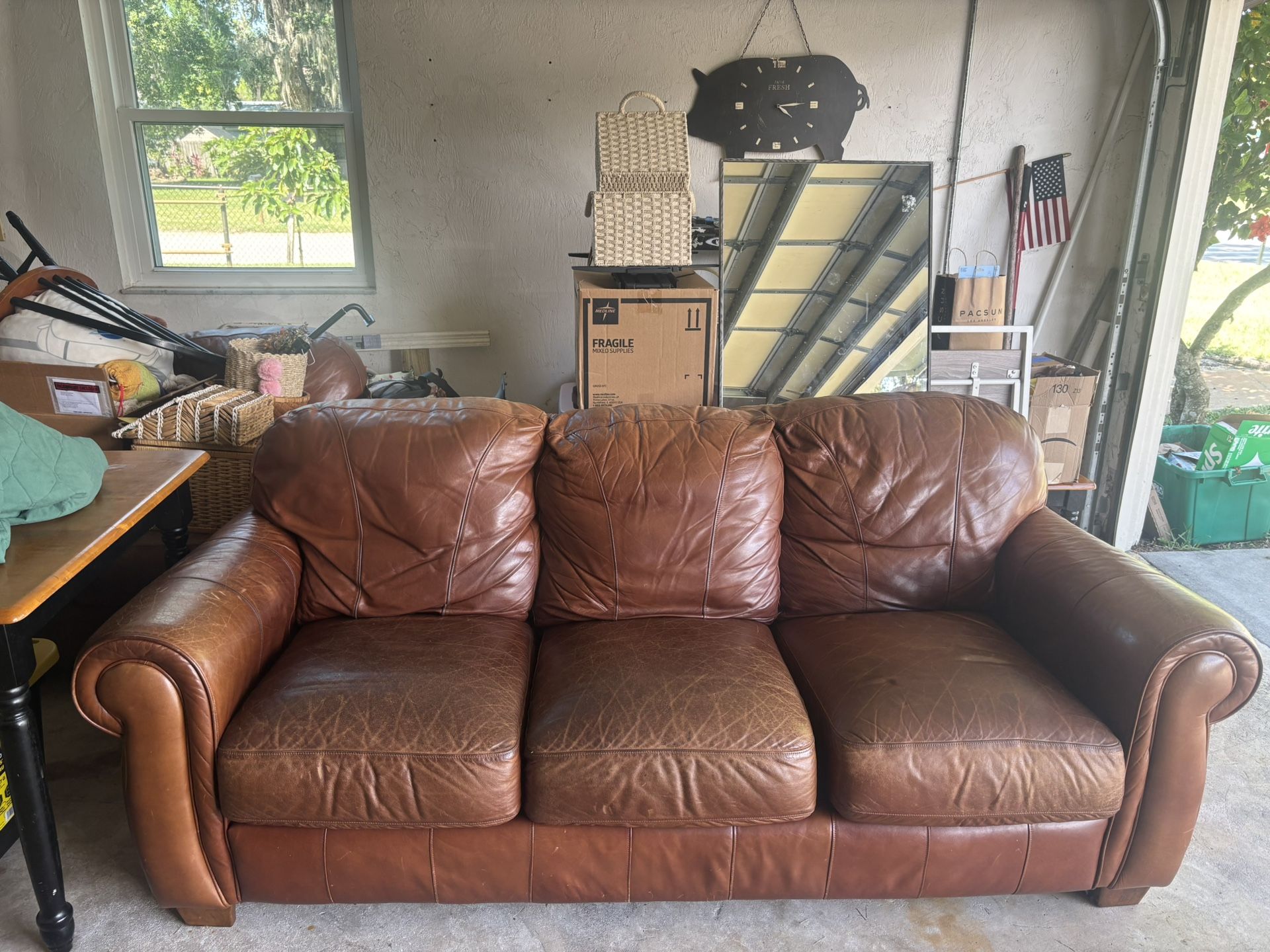 Selling a couch with the loveseat set for a steel. Originally over $3500 for the set. Normal wear and tear, no burns, no rips, no tears still has many more years on them. The couch is 7 foot wide 3 foot deep and the loveseat is 5 foot wide and 3 foot deep I would recommend a polish and conditioning and it’ll really bring them back to life . Daytona Beach pick up, cab deliver for an extra $50