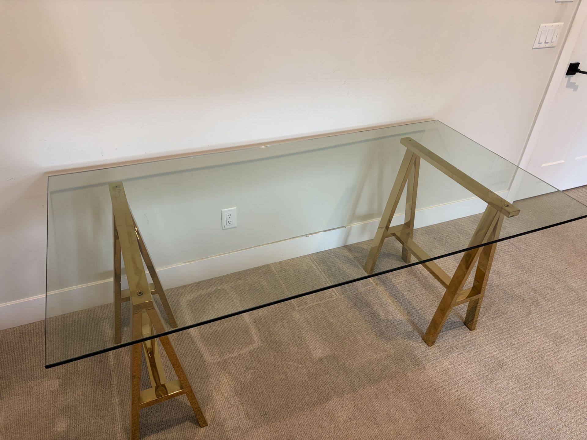 36” x 71” x 29.5 high Large glass desk with gold legs. The desk is in good condition. Please note that the glass is very heavy and will need at least two people to carry it.