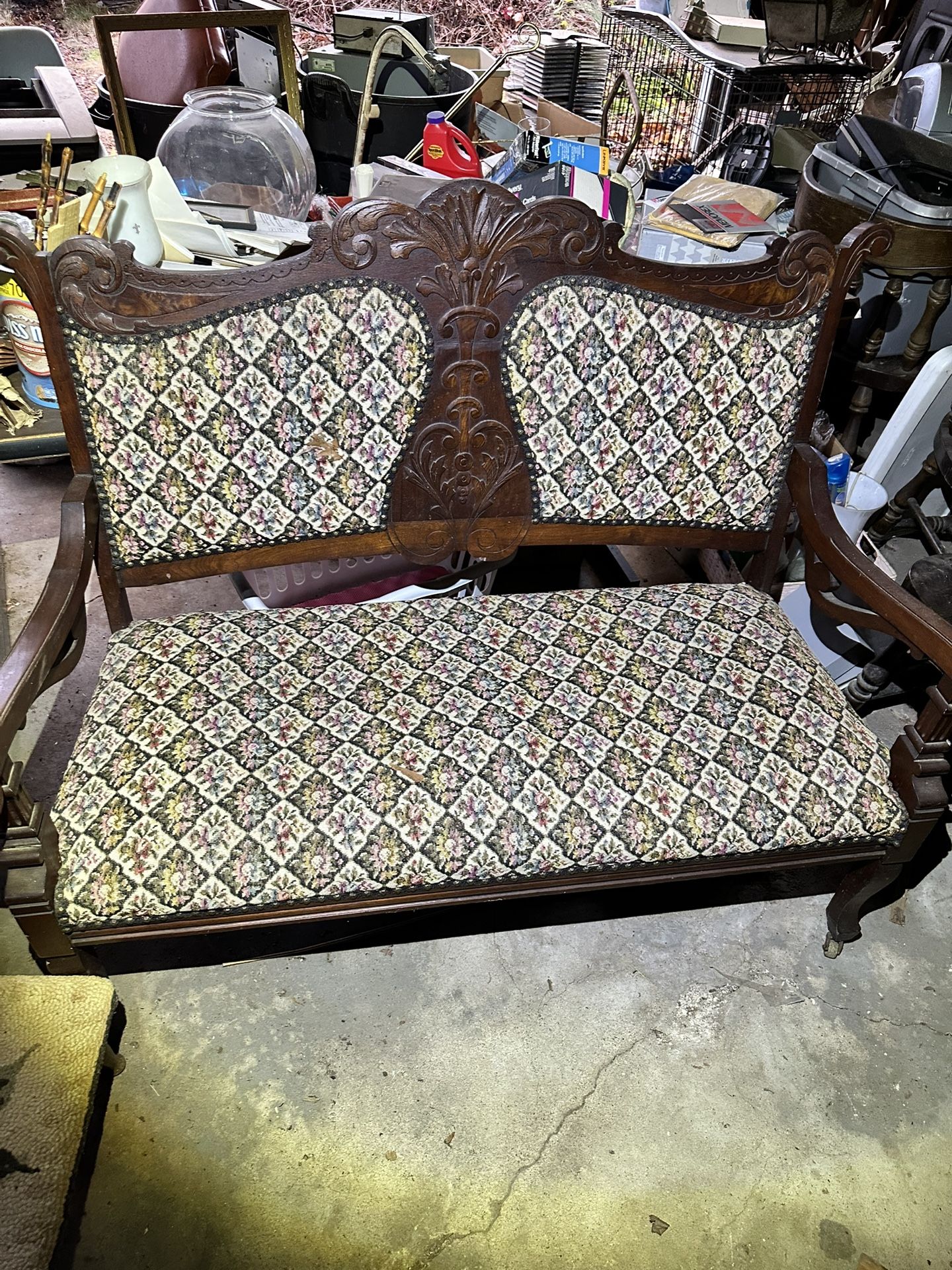 2 small and large Victorian / Eastlake-influenced carved settee (late 19th to early 20th century) Larger one - 49“ x 24“ x 38“ high Smaller one - 34 x 21” x 26” high Unbelievable find. From ChatGBT: It’s a small sofa or loveseat, typically used in parlors or entryways. These were common decorative furniture pieces during the late 1800s and early 1900s. ⸻ 1. Deep, Ornate Carving • The central crest features stylized foliage and scrollwork. • These motifs are typical of Victorian Rococo Revival or Eastlake Revival furniture. • The carving on yours is hand-carved, not pressed—good sign of quality. 2. Splayed Arms with Curled Ends • The curled or rolled hand supports point to late 19th-century influence. 3. Upholstered Back Panels • The two upholstered panels set into carved wooden frames were very common in settees from 1880–1910. • More affordable pieces from the time used this format instead of full upholstery. 4. Floral Tapestry Fabric • Likely not original. • The pattern looks mid-20th-century, so the piece was reupholstered at least once. 5. Cabriole-style front legs • Another Victorian element, though yours are more simplified than high-end Rococo pieces. ⸻ 📅 Estimated Age 1890–1910, give or take a decade. ⸻ 🪵 Likely Wood Probably walnut or mahogany, both common in American and European Victorian settees.