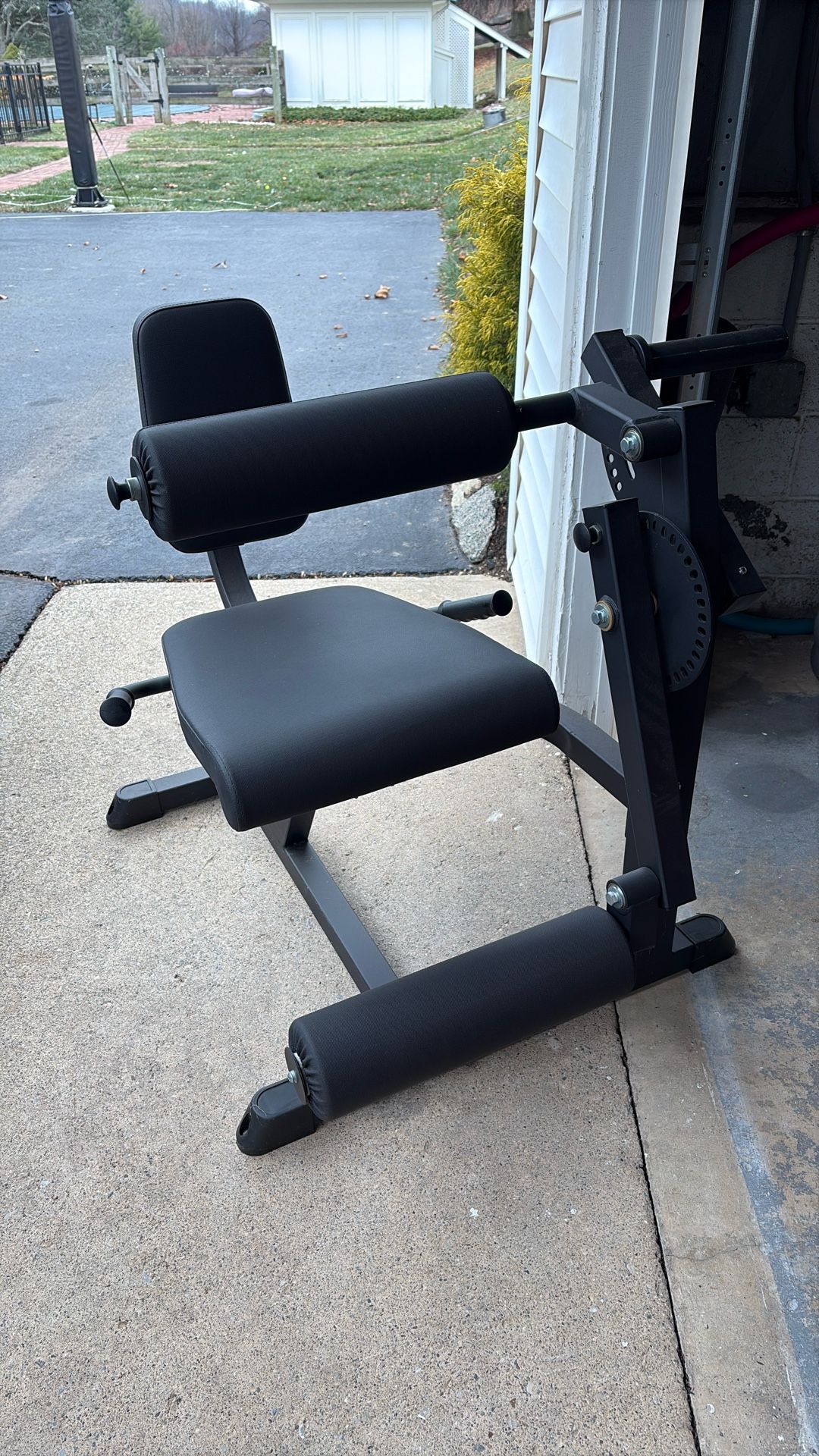 Plate loaded machine that can be either a seated leg curl or leg extension. Slightly worn to new condition. Adjustable backrest and seat. (3ft, 8in wide) (5ft long).