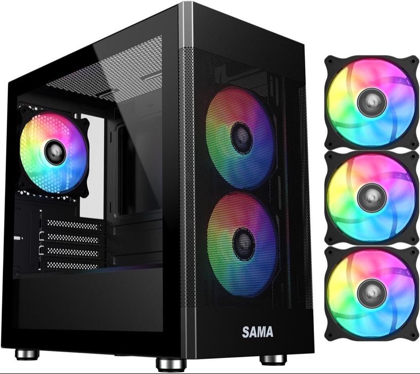 Sama ARGB-Q5-BK Black USB3.0 Tempered Glass Micro ATX Tower Gaming Computer Case w/ 3 x 120mm ARGB Fans (Pre-Installed)