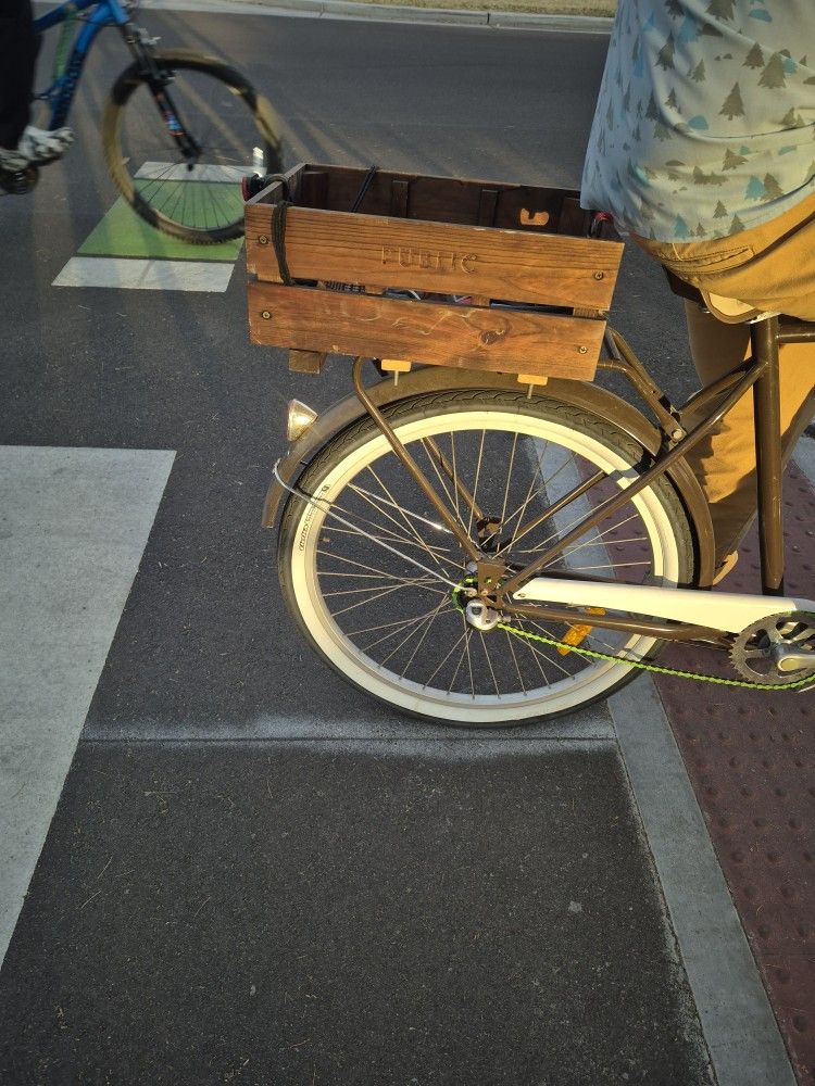 Shoe polish brown. Almost edible. I make them fit custom to ur bike. Install $25. With or without spaces between the panels. Great 4 coffees, farmers market, 6 pack , bike lock or just ur junk in the trunk. Price does not include bike rack = typically $45. Pls check out my numerous beautiful bikes, also can be customized, by clicking my profile.