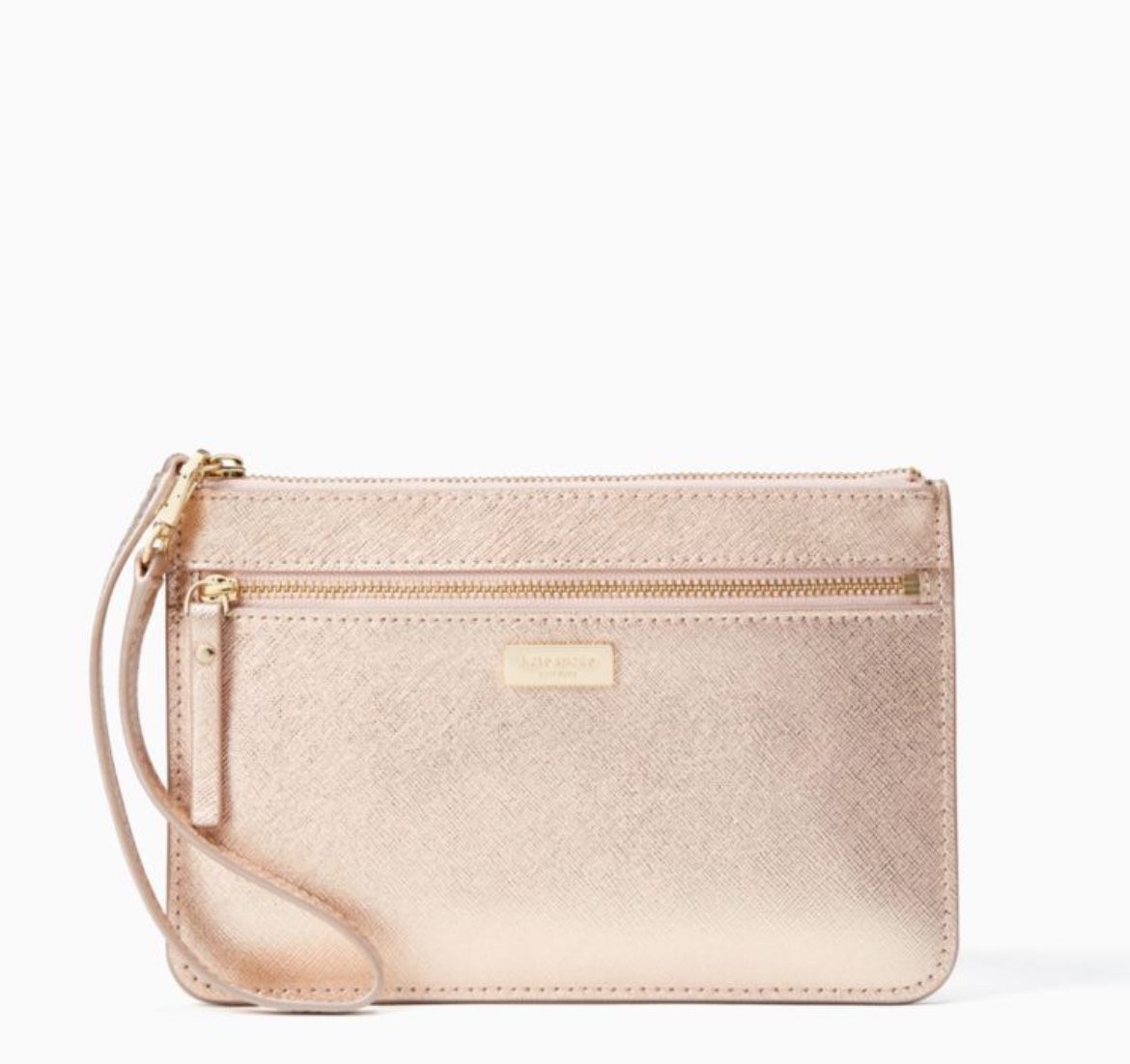 New Kate spade tinie Laurel way wristlet clutch A beautiful shiny rose gold clutch from KS Metallic and pretty. New with plastic string and booklet. So perfect! Exterior pocket and interior card slots. Selling out soon! Pet smoke free shop 8 x 5