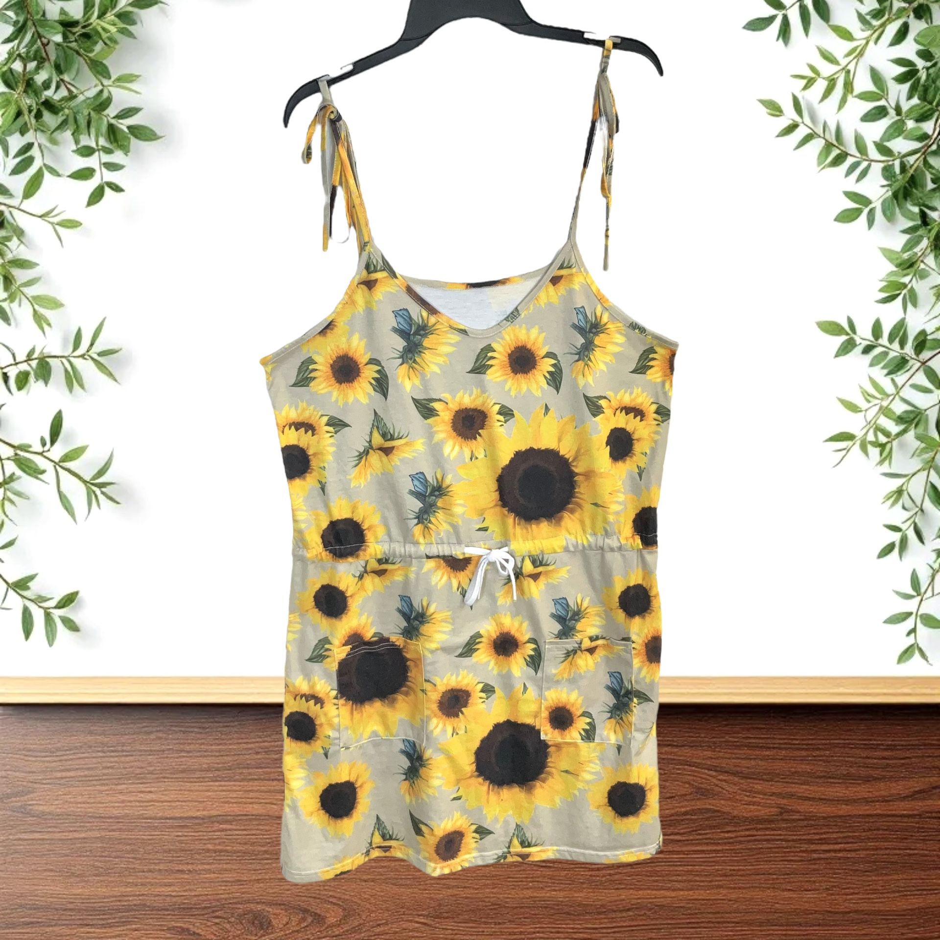 Unbranded Tan w Sunflowers Tie Spaghetti Strap Dress Women XL Elastic Drawstring Tie Waist; Pockets on Front Measures 23” Across from Pit to Pit Pre-Owned Excellent Condition Length 33” - About Knee Length (or Just Above or Below) 95% Polyester, 5% Spandex for Great Stretchability
