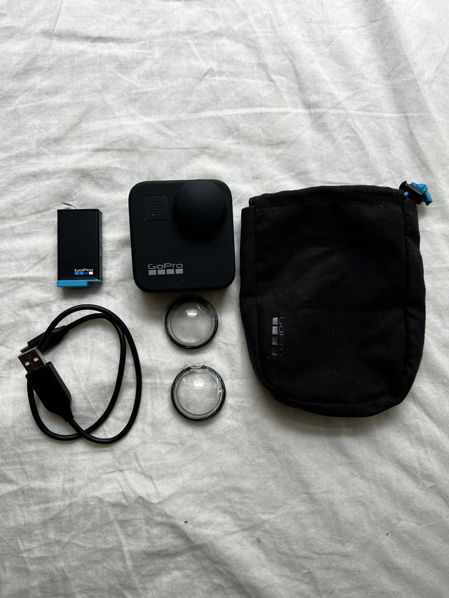 GoPro Max bought for 500$ just a few months ago, lightly used to film 360 footage. Recently got a new camera and have not been using this one as much. Perfect condition. Lightly used, 70 dollar discount from the new price with same quality. Comes with: GoPro Max Battery Charger Carrier Bag Lense cover