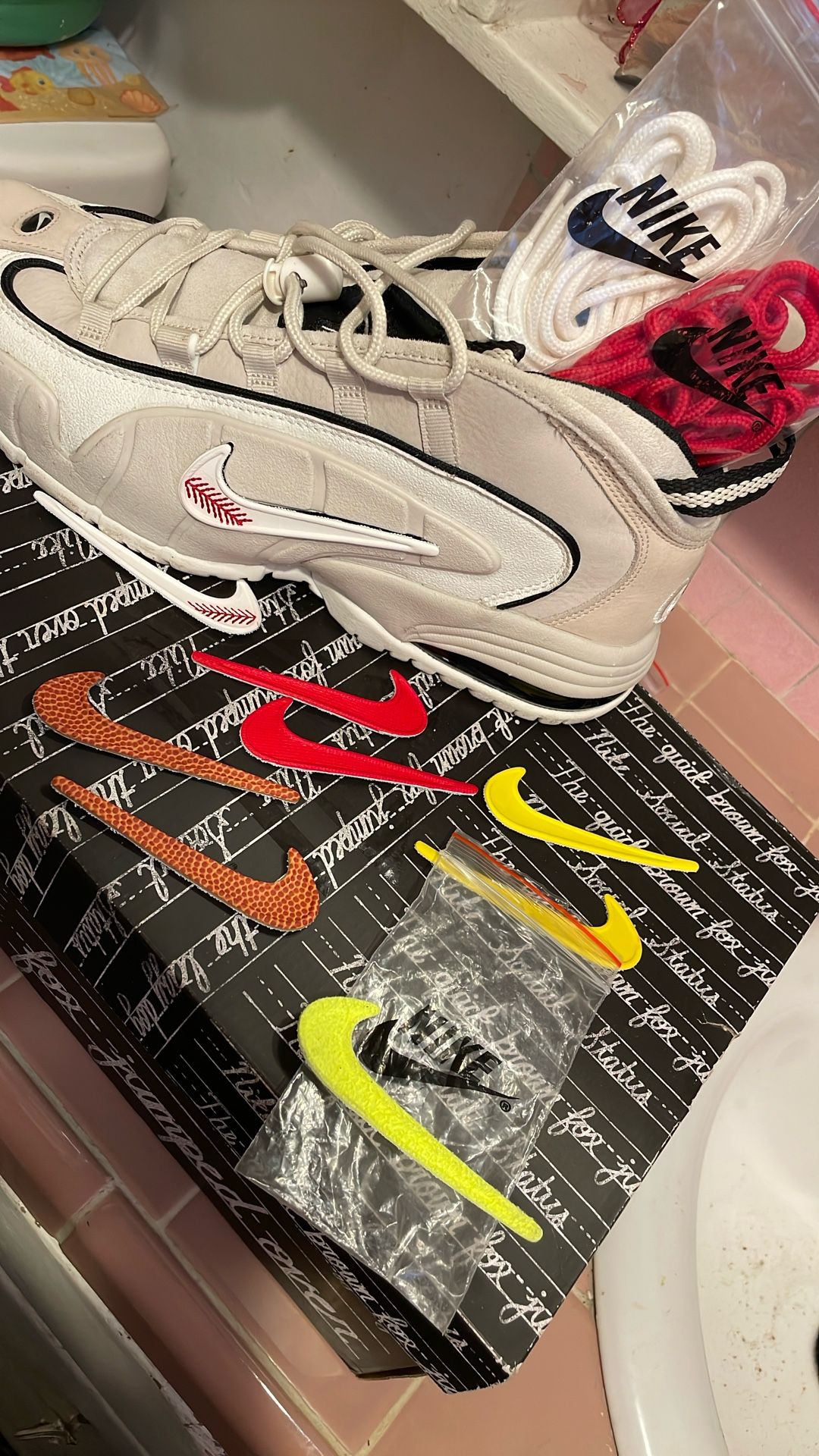 Worn once Reversible Nike swoop Addition laces RED AND WHITE Additional Nike swoops , Basketball , Baseball as shown on picture , Yellow , Red , lime green as shown on picture and Black is the original. Size 12 Best offer Cash only Message for any question Pictures taken 1/6/15