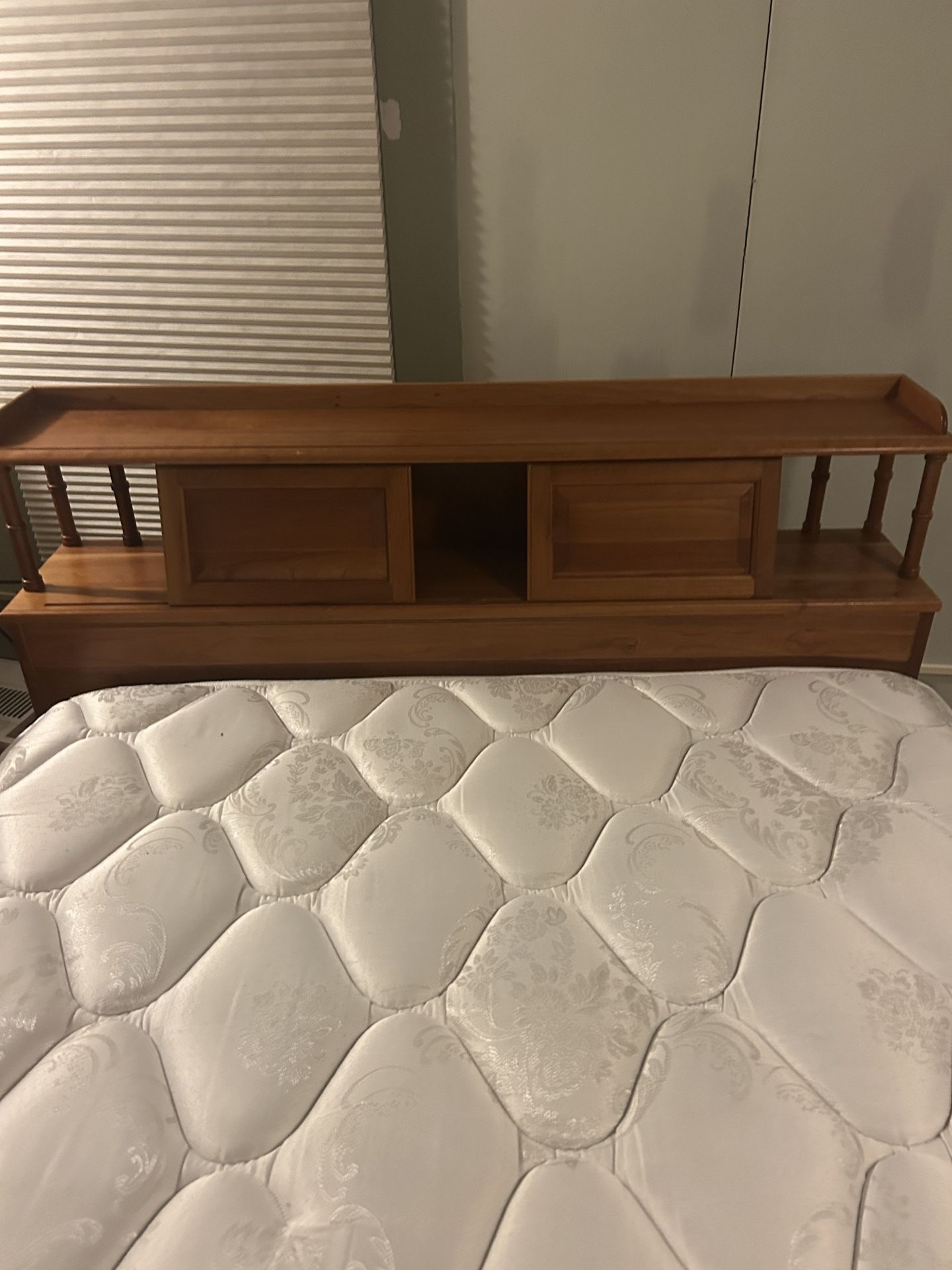 Beautiful oak cabinet headboard & dresser set . Mattress, box spring and frame complete bed set. Dresser has 5 drawers and a nice sized mirror mounted to the back. Like new condition, was in guest room so hardly used at all. Pennsylvania house brand furniture .
