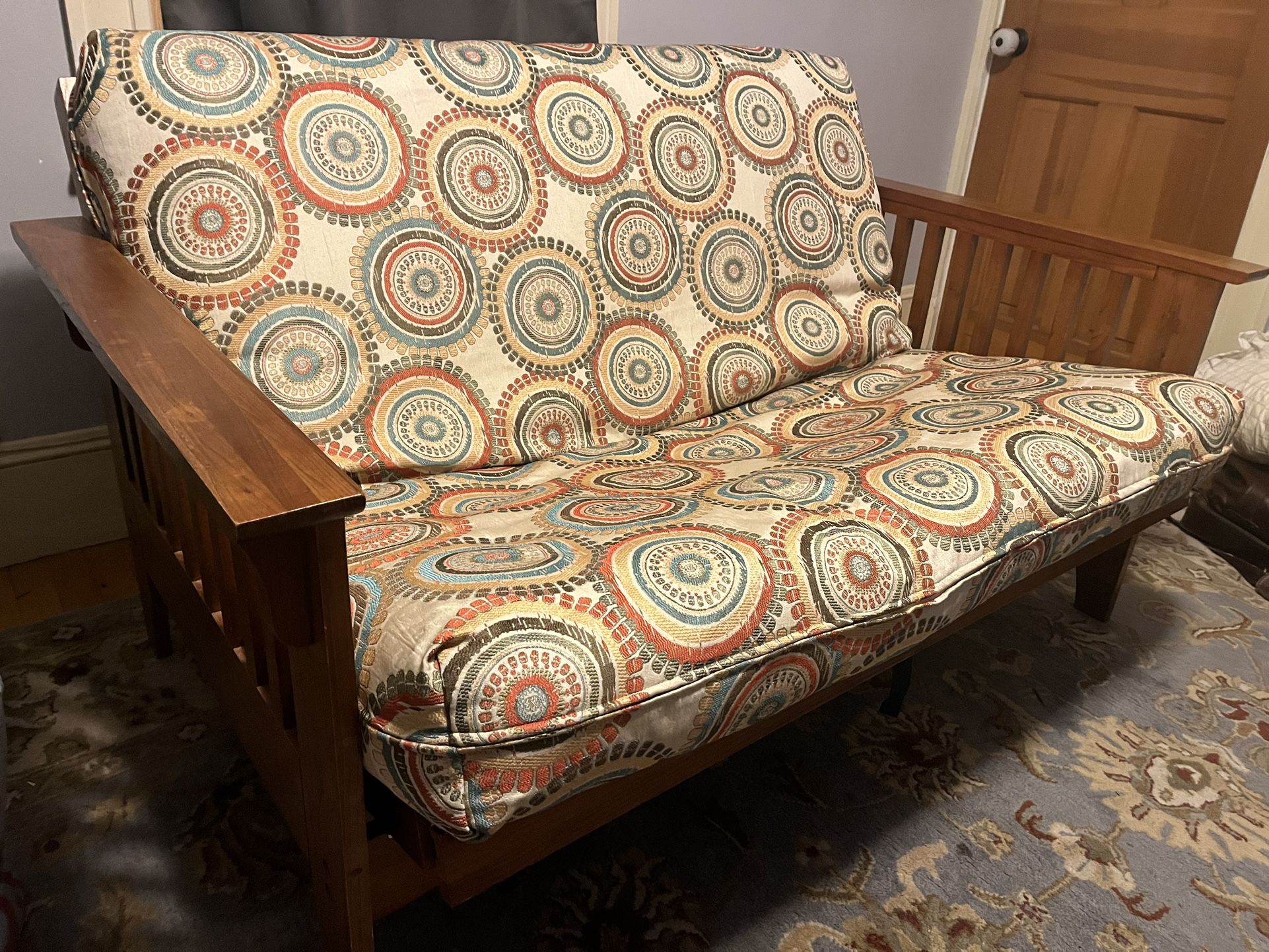 Futon in (I believe) acacia wood. Purchased many years ago, still works great but we wanted something larger. There are some scratches and a few cracks in the slat system (not visible when in use). The cracks have been there for many years and haven’t impacted our use of it in any way.