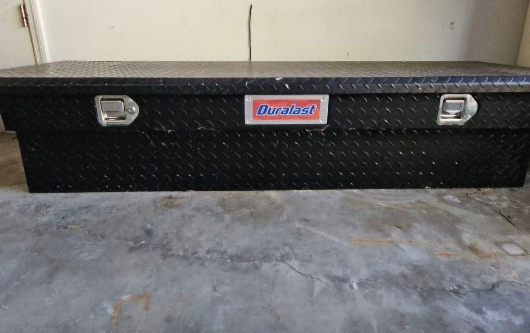 Heavy-duty Duralast steel crossover truck tool box. Black diamond plate finish. Mounts across the bed of a pickup truck behind the cab. Approx. 68 inches wide (see tape measure photo). Solid condition with normal cosmetic wear from use. Latches and hinges work as they should. Great for storing tools, straps, or equipment in your truck bed. Pick up Minneola