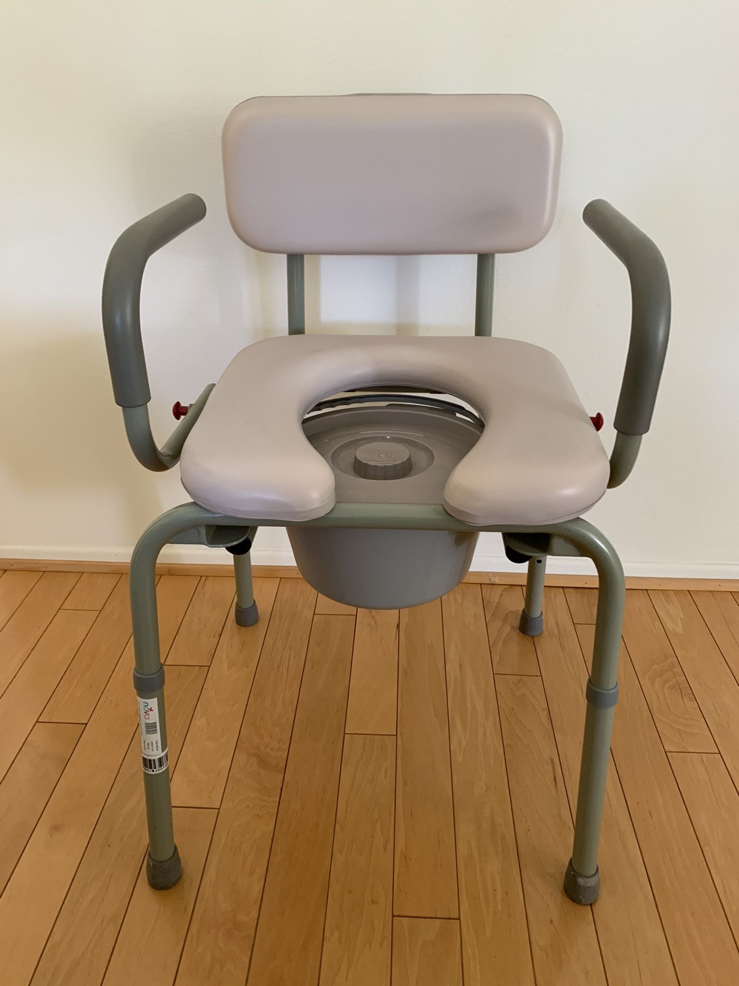 The Padded Drop-Arm Commode is designed with a push button operated drop arm for easy patient transfer. It has a backrest, as well as a padded seat and soft foam handles for user comfort. Includes bucket, lid and splash guard. Excellent condition. Make offer!!