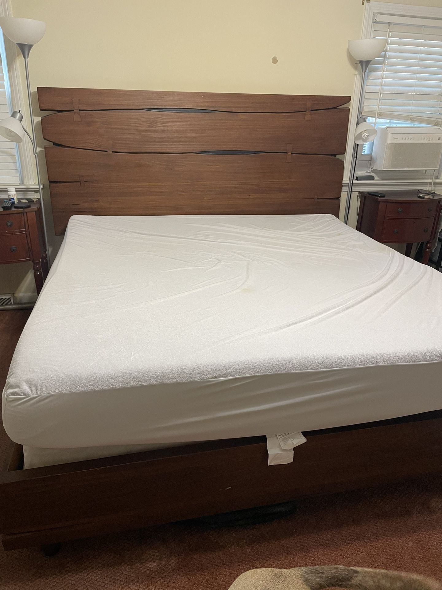King Bed Frame and Headboard. I’ll throw in the Tuff & Needle foam mattress and box springs if wanted. Asking $260 OBO. Can deliver for fee.