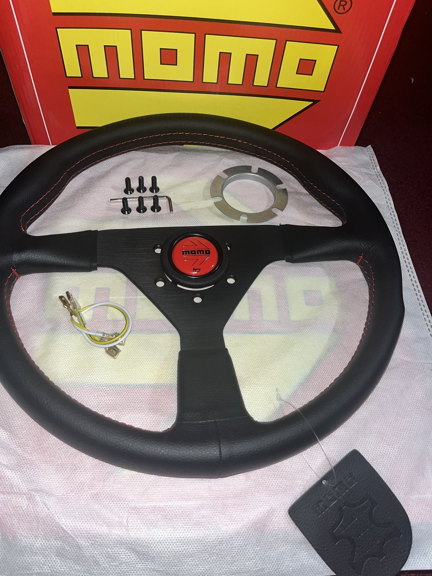 I have a brand new Universal 14 inch V1 MOMO Wheel W/ Horn cap & Red Stitching. 350MM In diameter, includes 6 screws, Horn wiring, horn button & horn button rings! The wheel is universal and will fit for any hub/QuickRelease system! The Wheel is in great condition! Clean, and no rips or tears in the leather! Stitching is also in great condition no threading at the seams! I originally bought it to install in my pickup but I decided I rather keep my Airbags. Asking $170 Or Best Offer! I accept Zelle or Cash Offers Only!