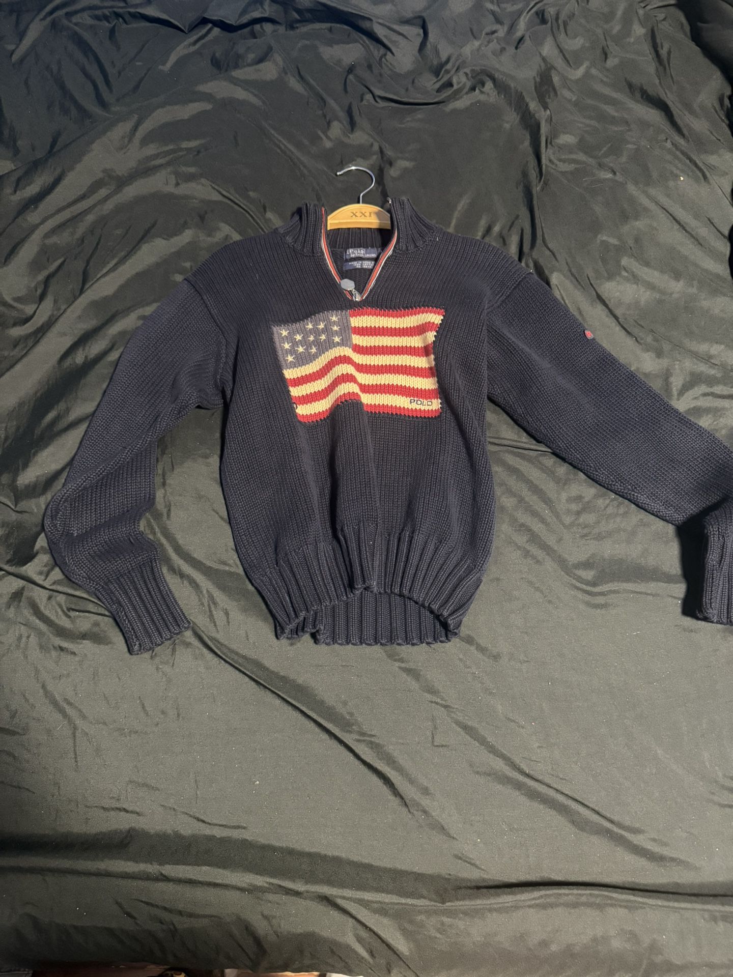 Authentic Polo Ralph Lauren knit sweater featuring the iconic American flag design across the chest. Navy blue waffle-knit texture with ribbed cuffs, hem, and quarter-zip collar. Classic vintage Polo look.