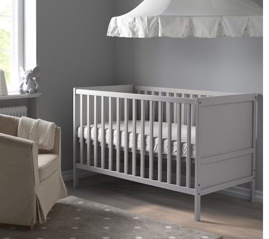 White baby crib. Two crib height positions. Turns into toddler bed. Will not go lower